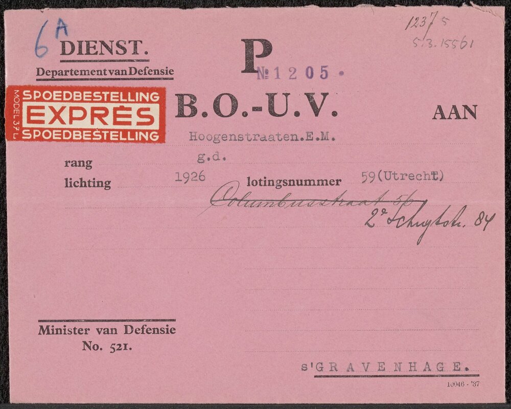 Enveloppe B.O.-U.V. gericht aan E.M. Hoogenstraten