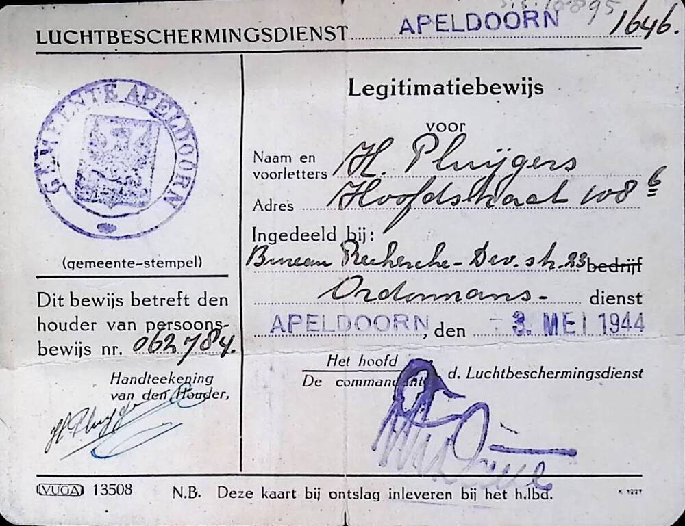 Legitimatiebewijs van de Luchtbeschermingsdienst Ape...