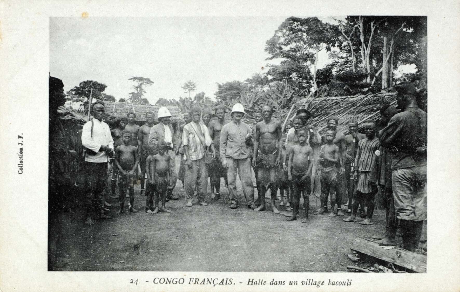 Portret van europeanen en dorpsinwoners voor de woni...