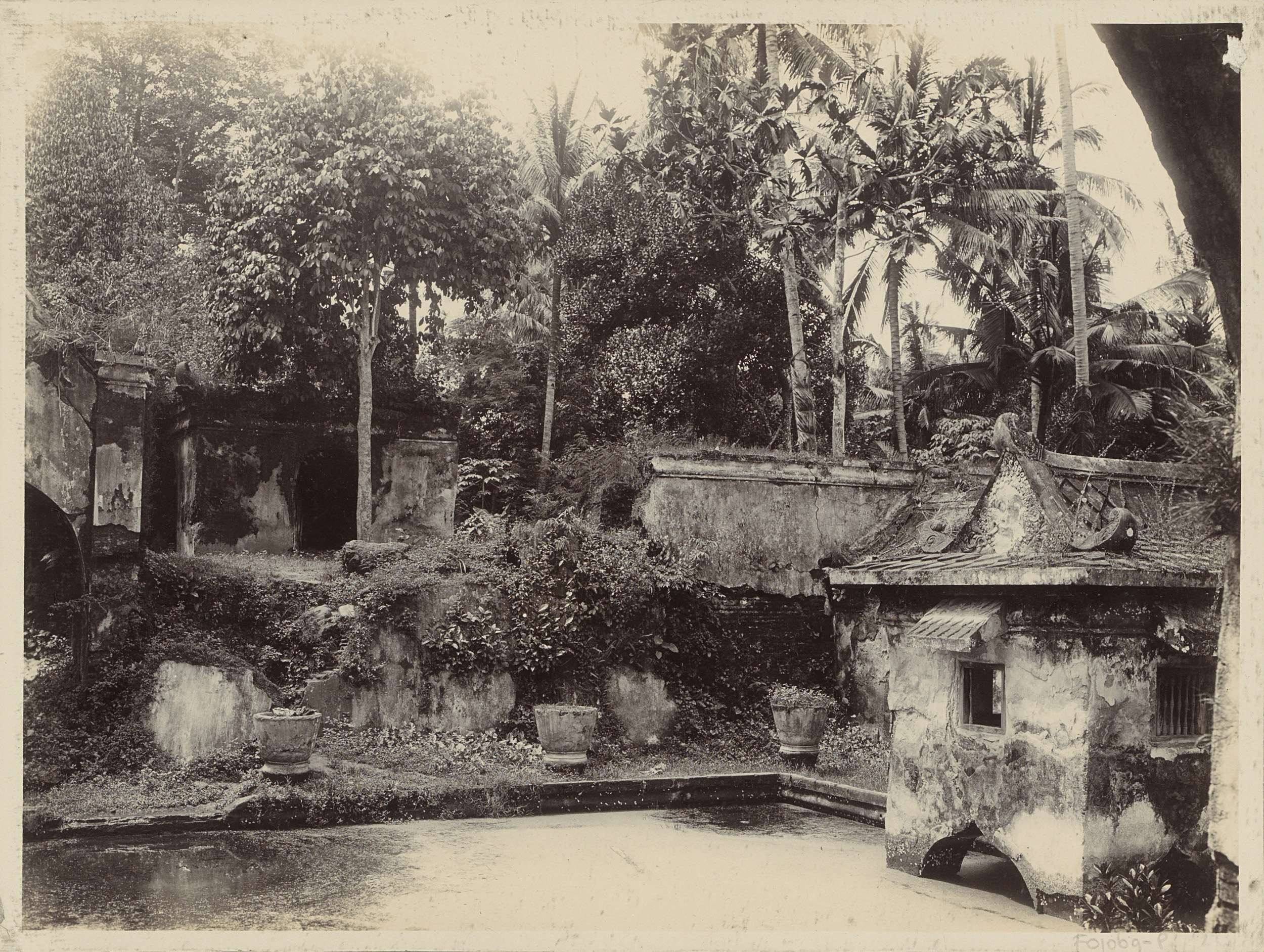 Vervallen gebouwen bij een vijver in Nederlands-Indië