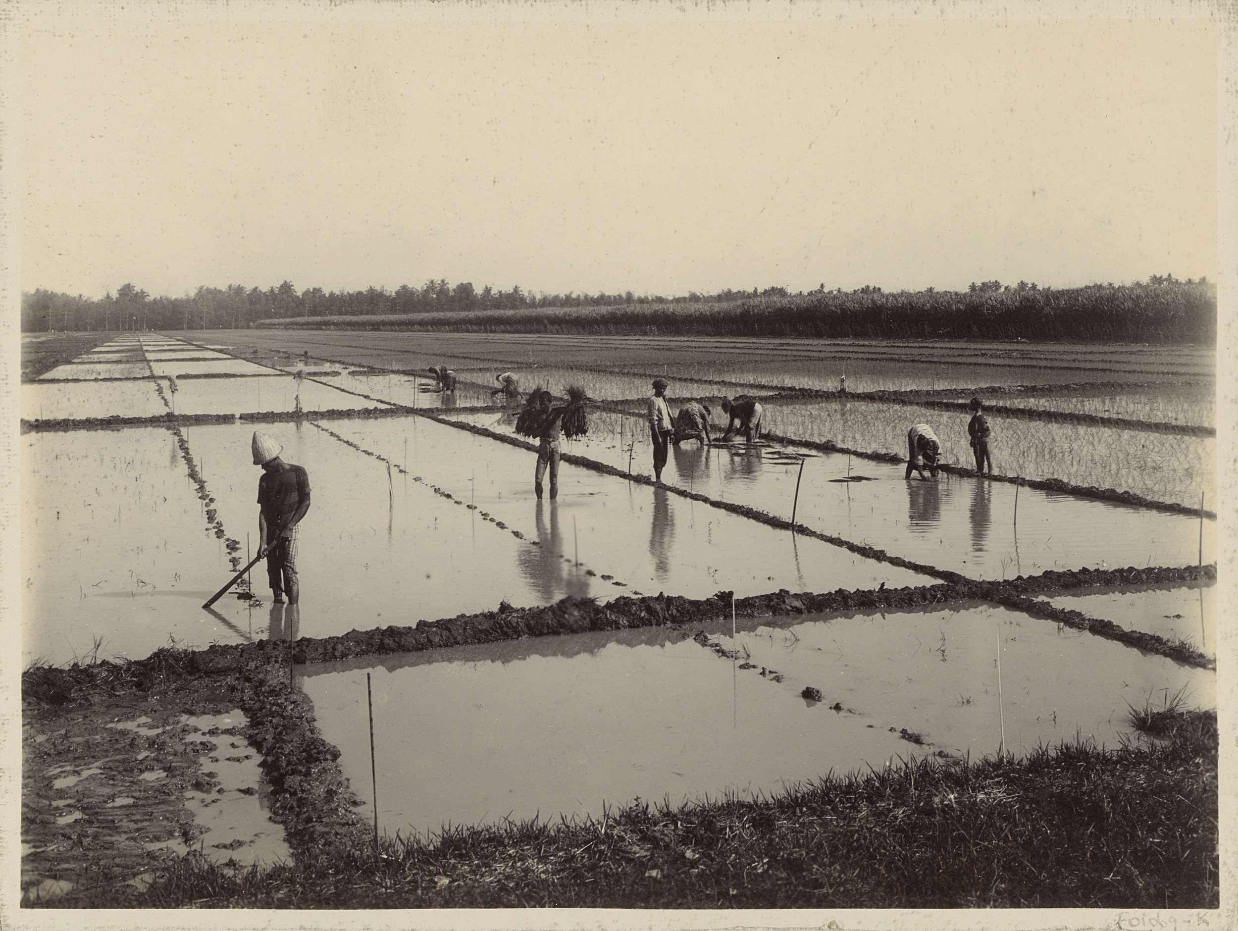 Landarbeiders werkend op rijstvelden in Nederlands-I...