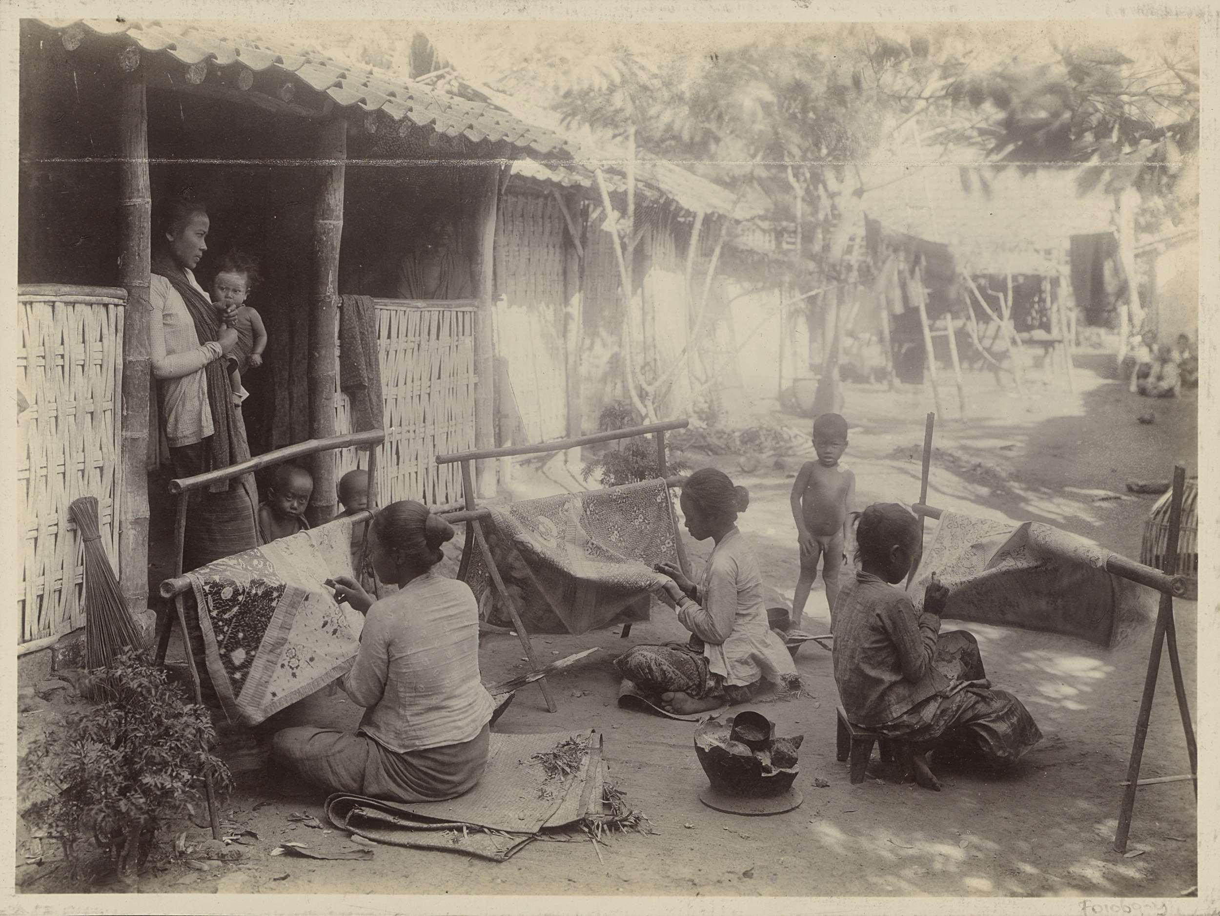 Batikkende vrouwen op een erf
