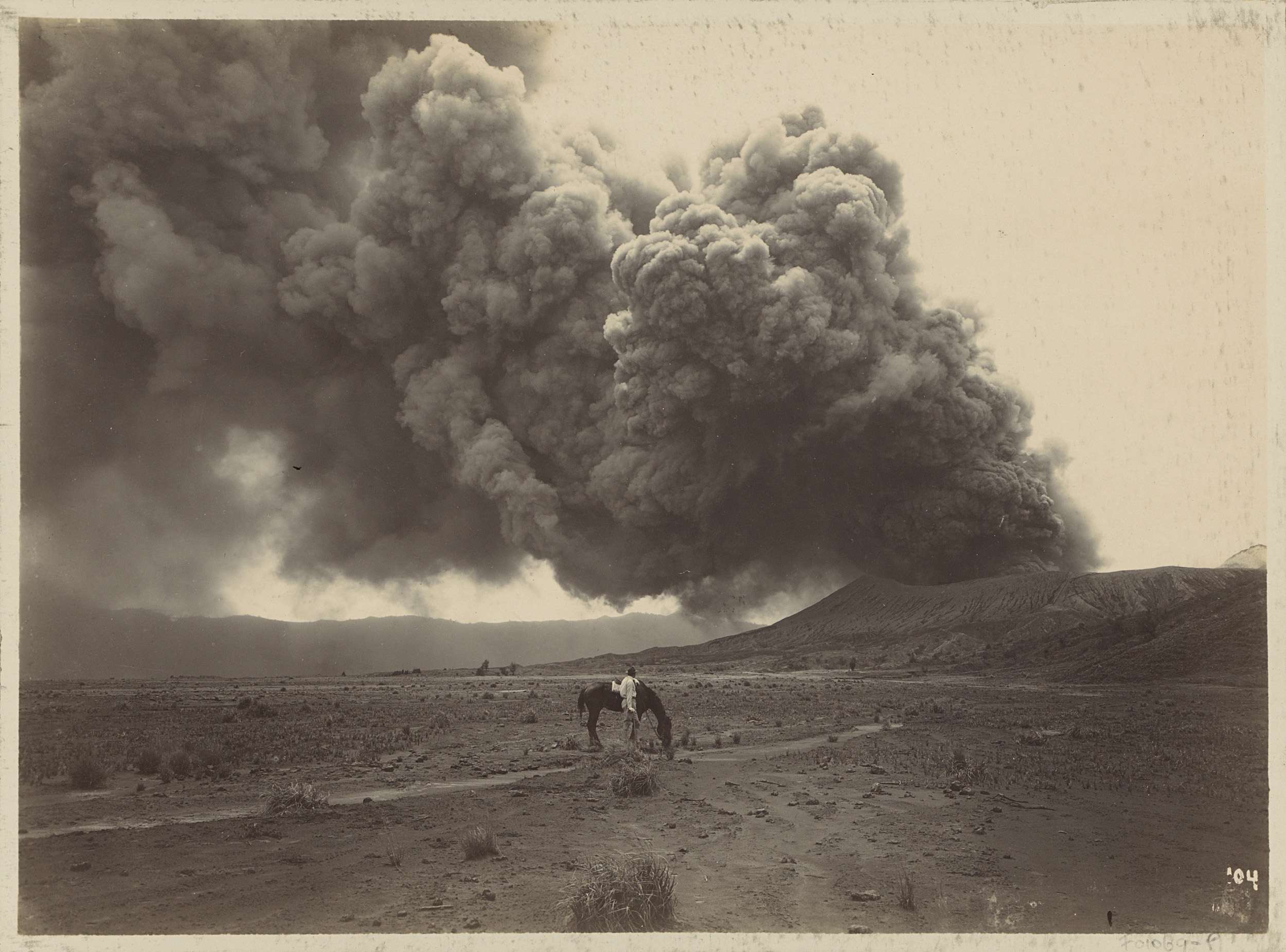 Man met een paard voor een rokende vulkaan in Nederl...