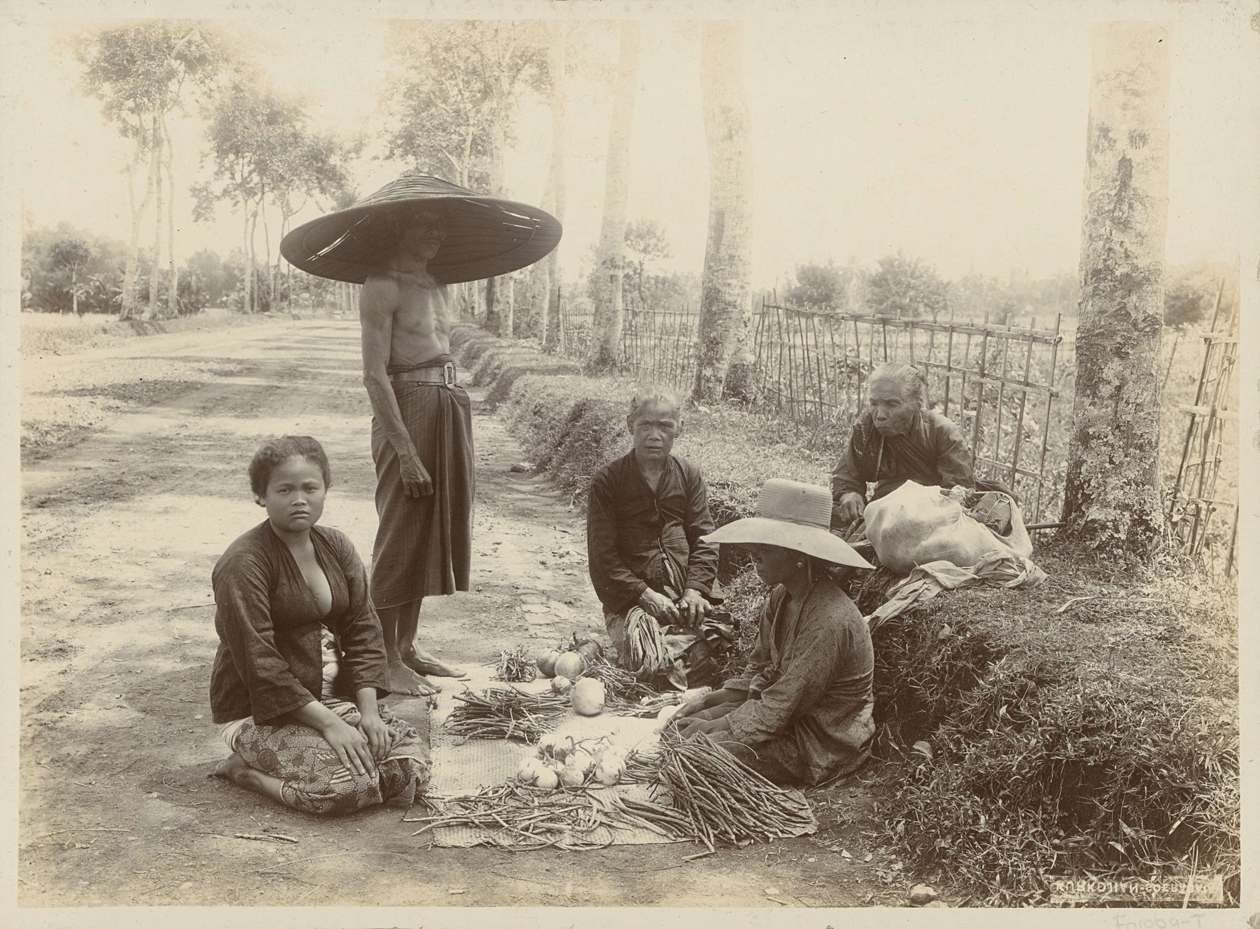 Vrouwen en man met uitgestalde groenten langs de kan...
