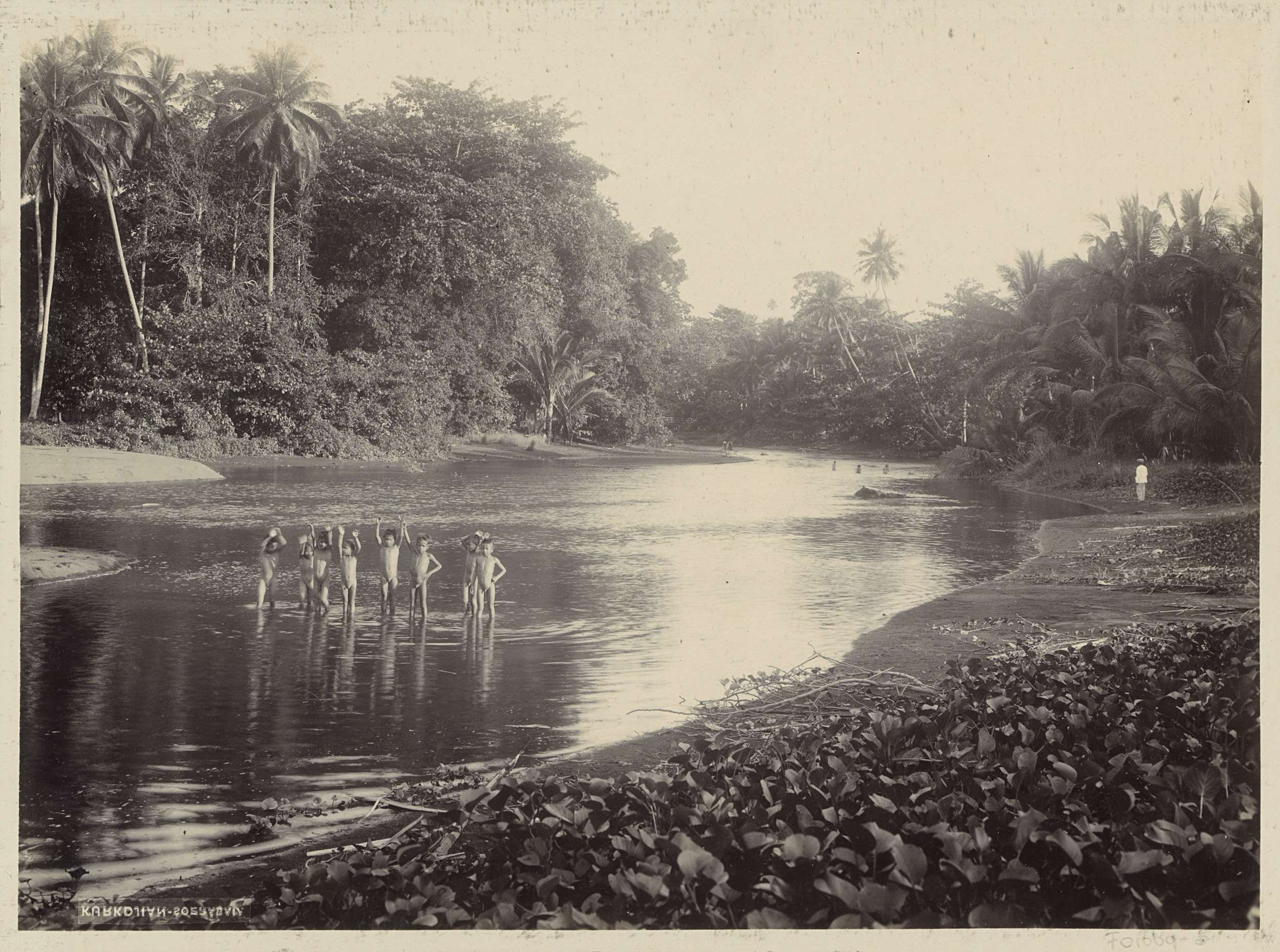 Badende kinderen in een water in Nederlands-Indië