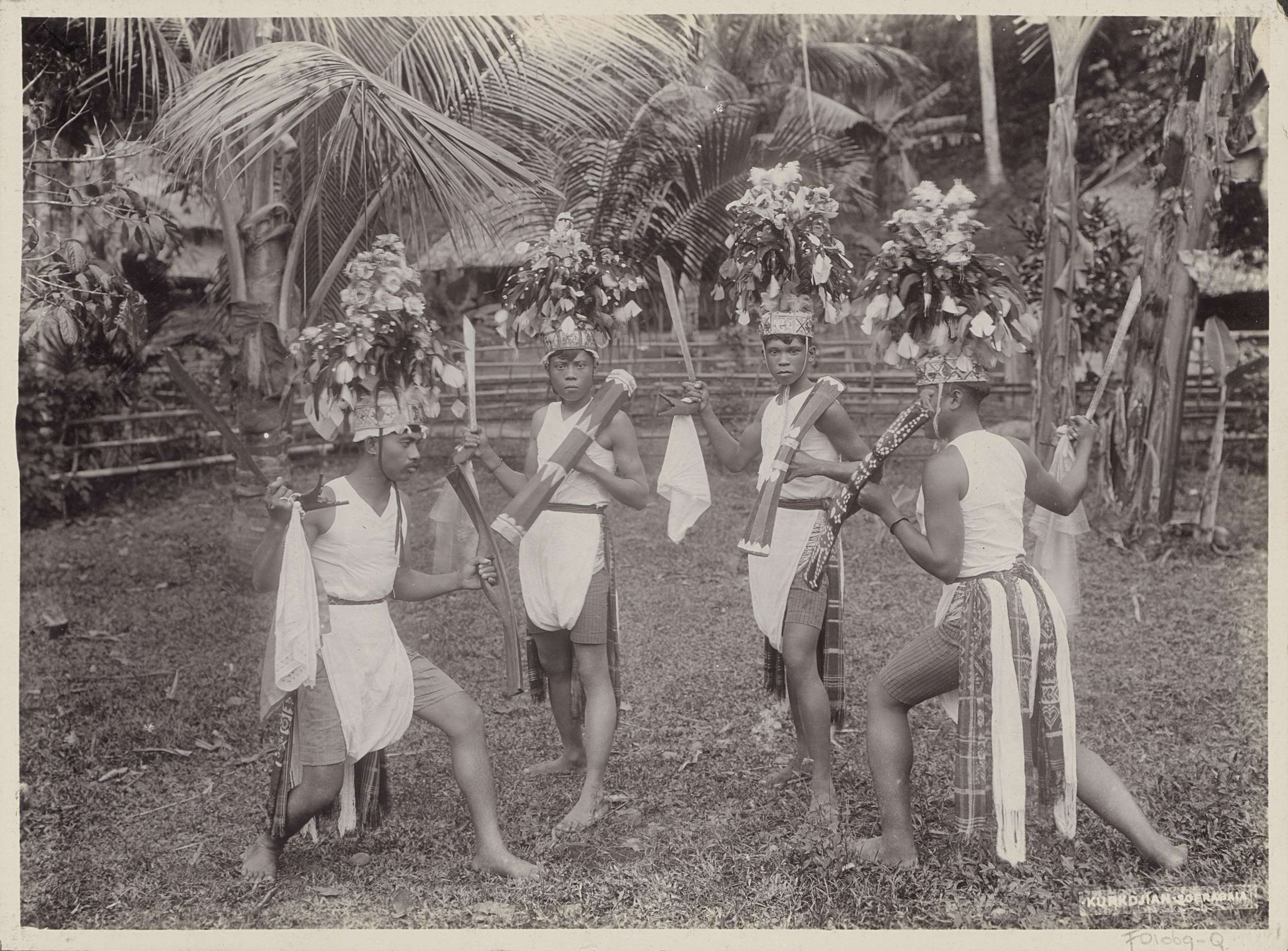 Indonesische jongens in kostuums dansen met krissen ...