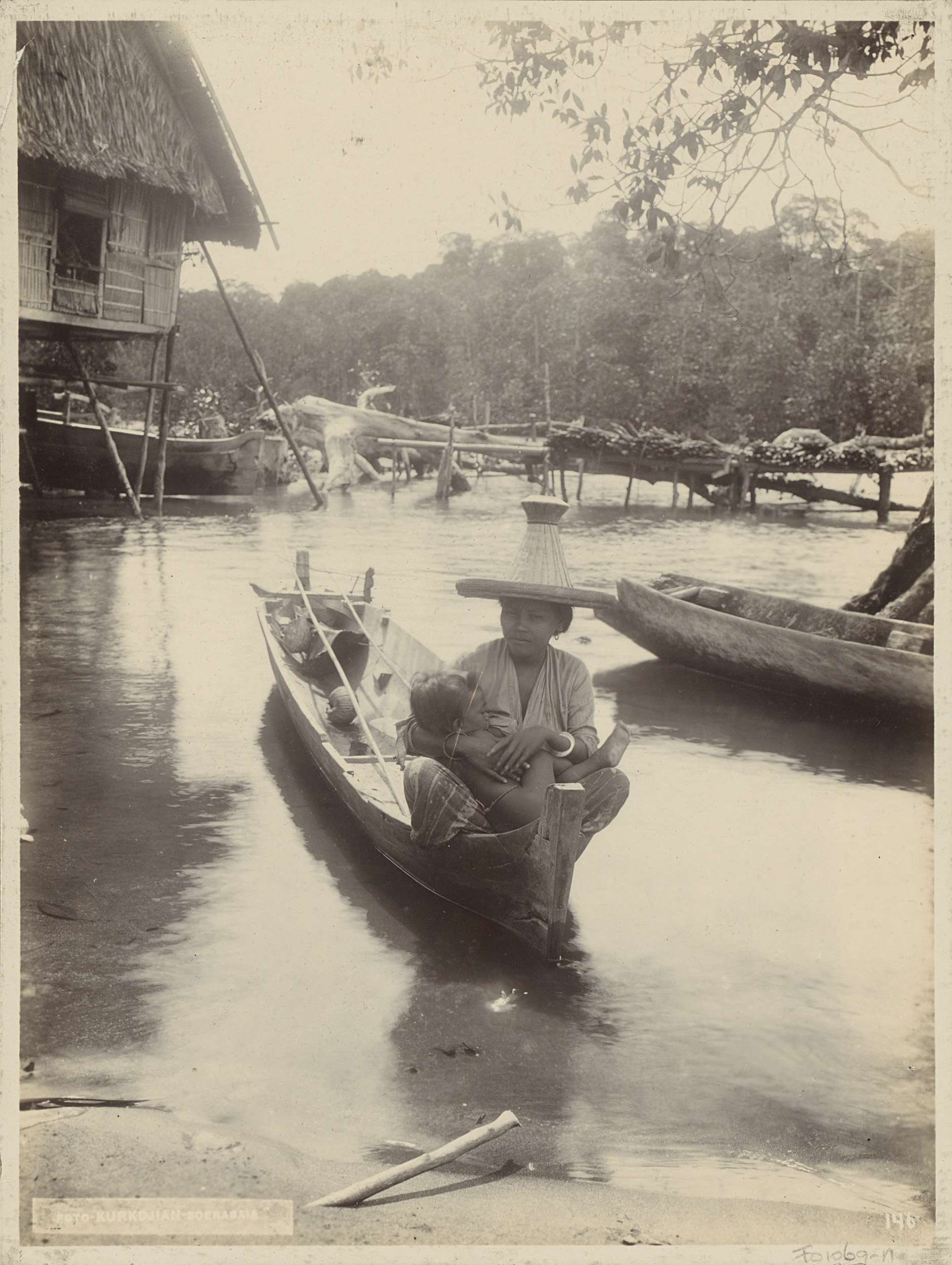 Vrouw zoogt kind in een boot, mogelijk in Surabaya