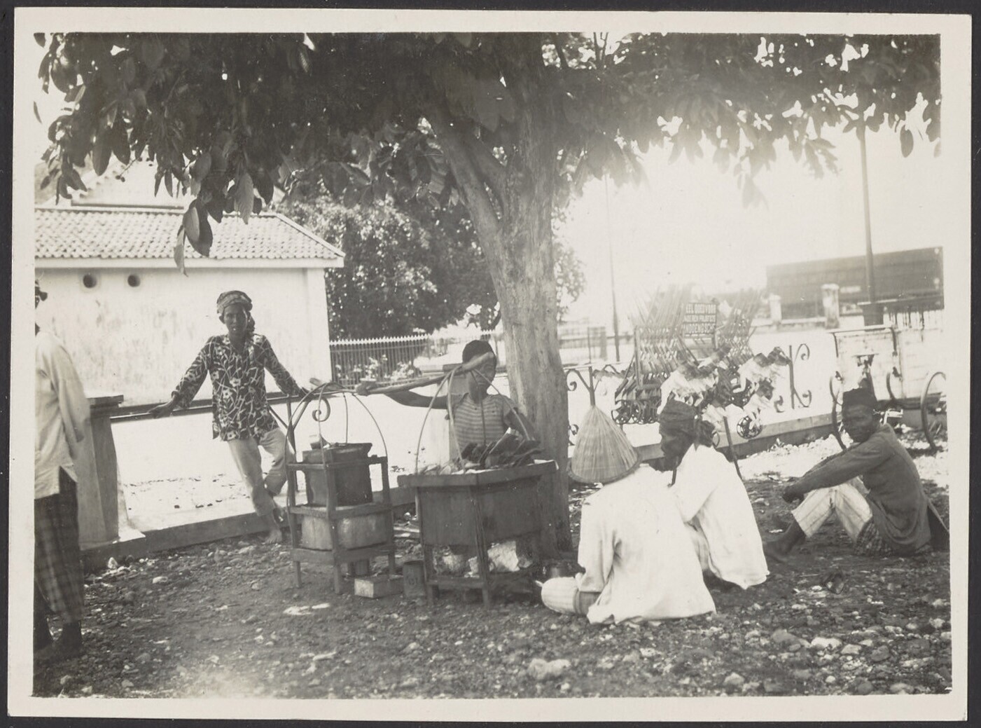 Javaanse mannen bijeen bij een marskramer op de straat