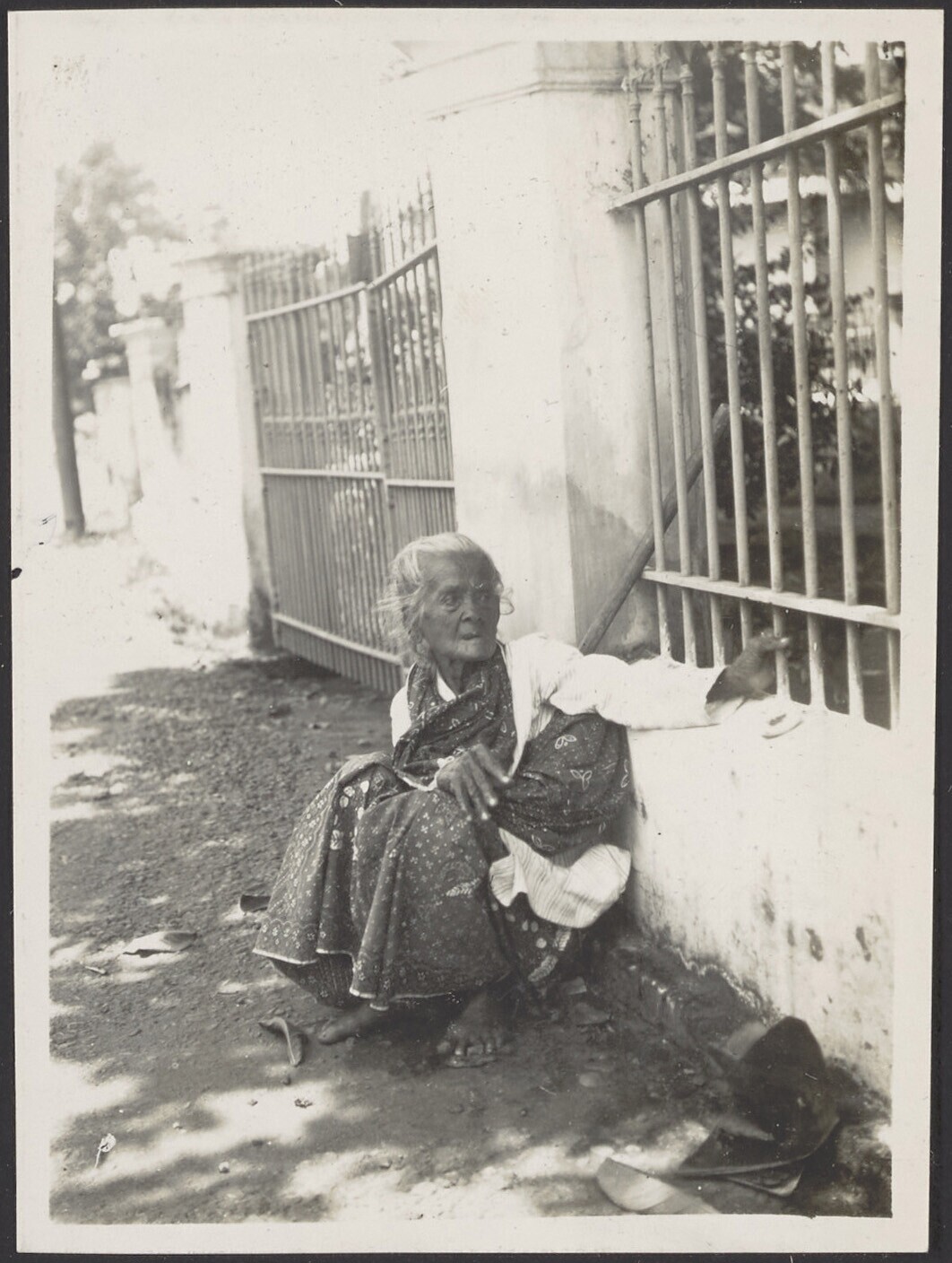 Oudere Javaanse vrouw zit bij een muurtje op straat