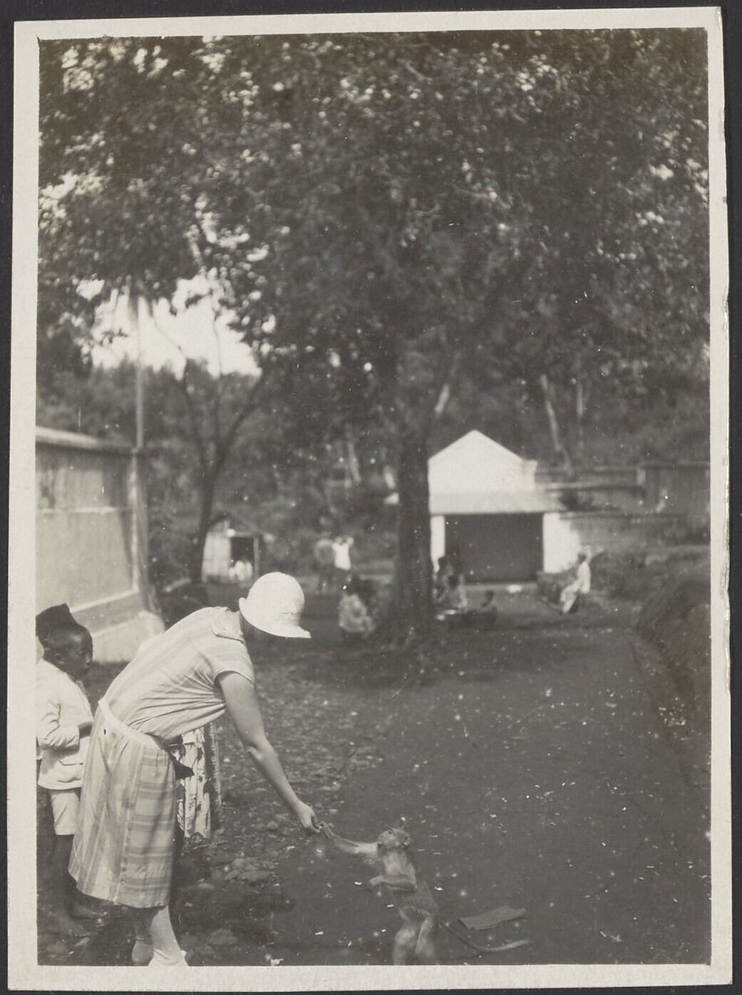 Europese vrouw geeft aapje een hand op straat