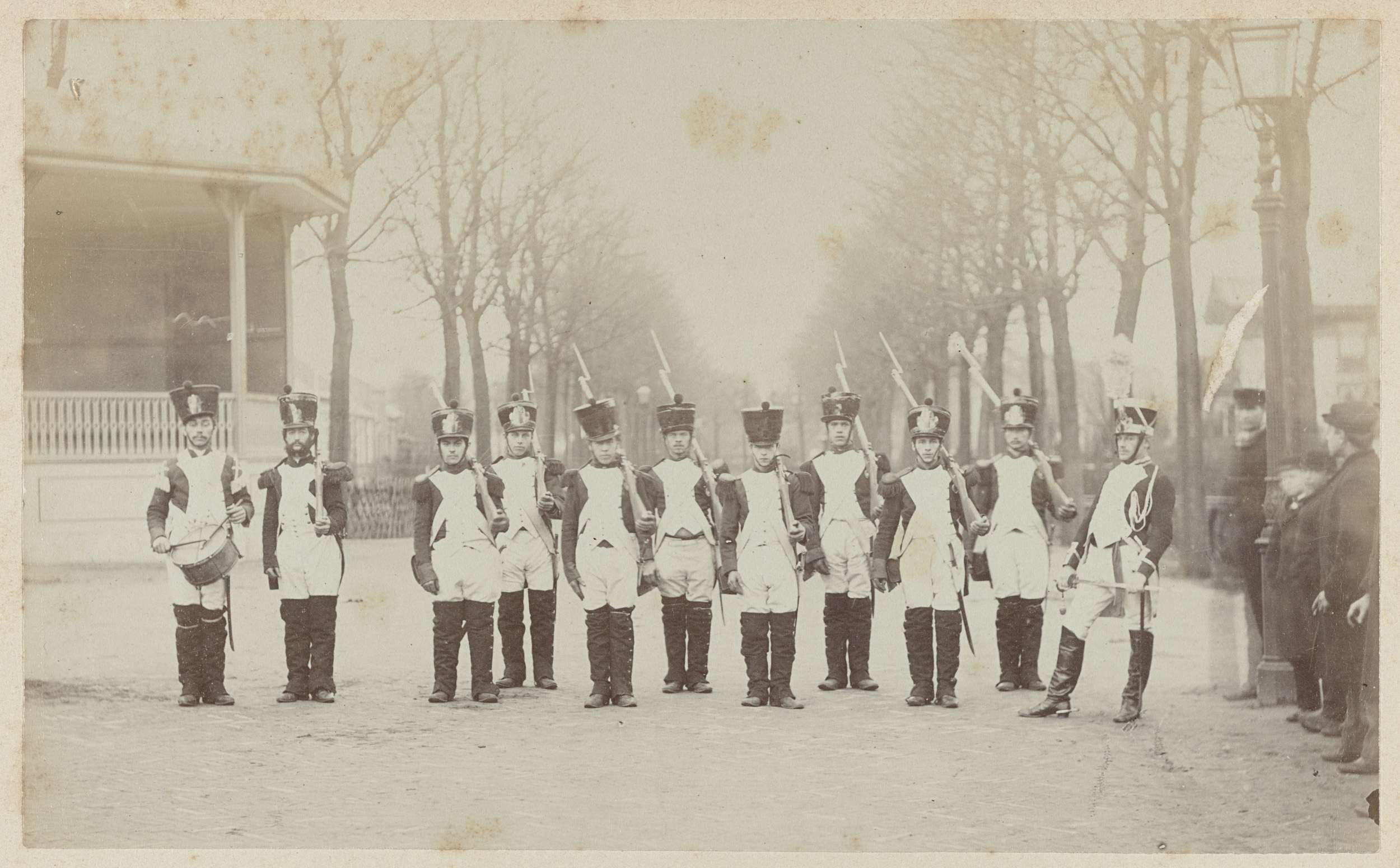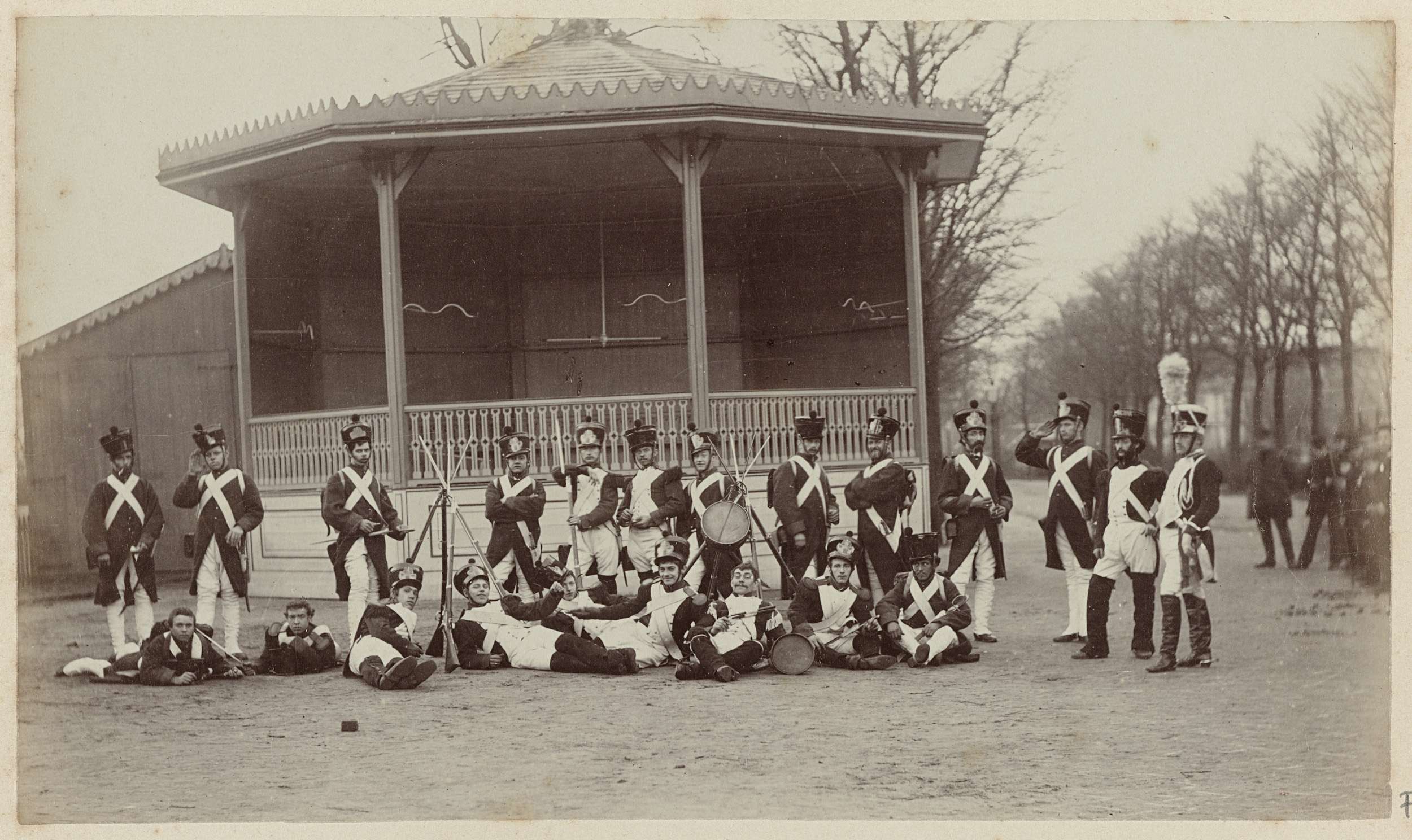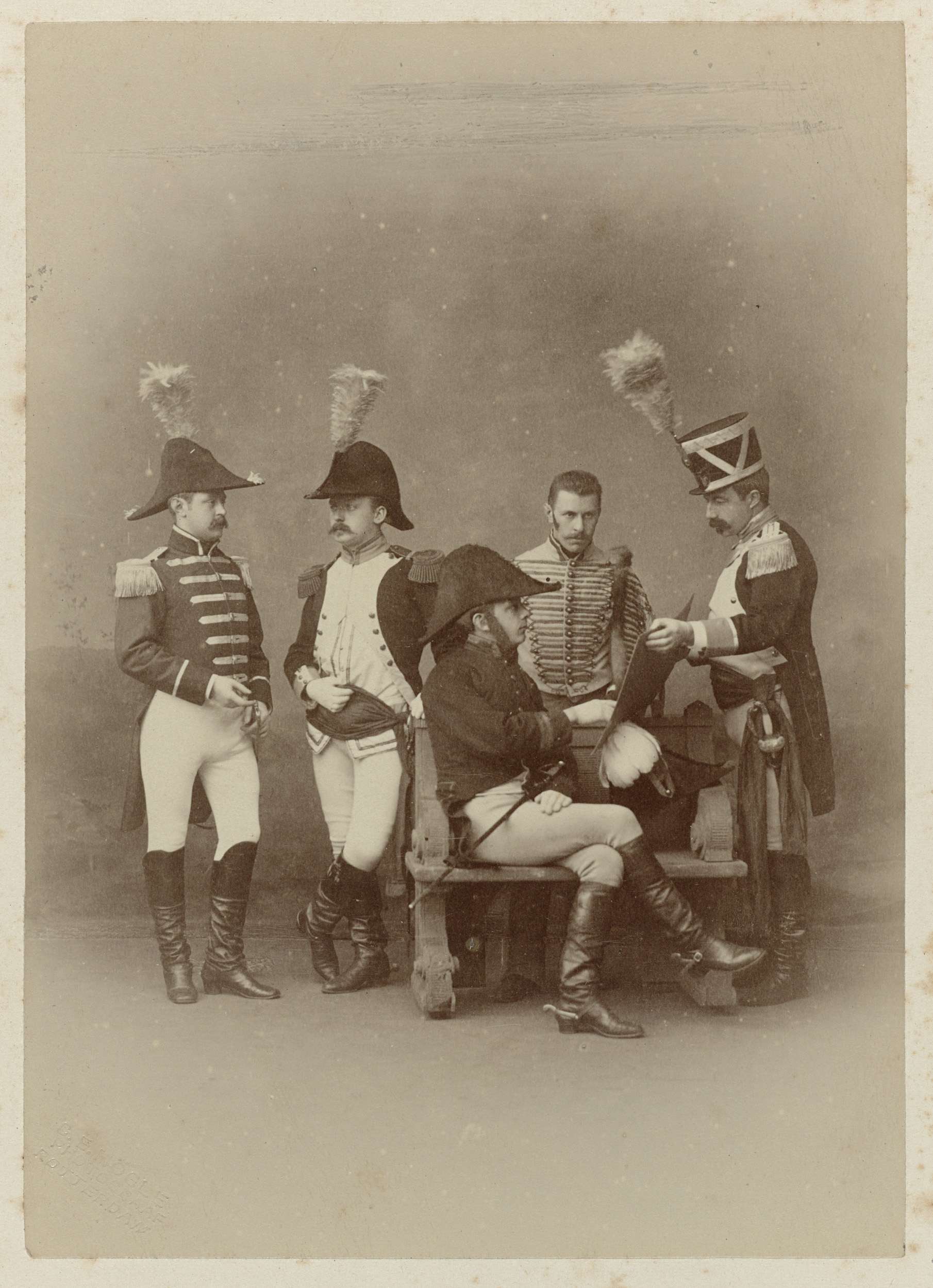 Vijf heren in historische militaire uniformen ter ge...