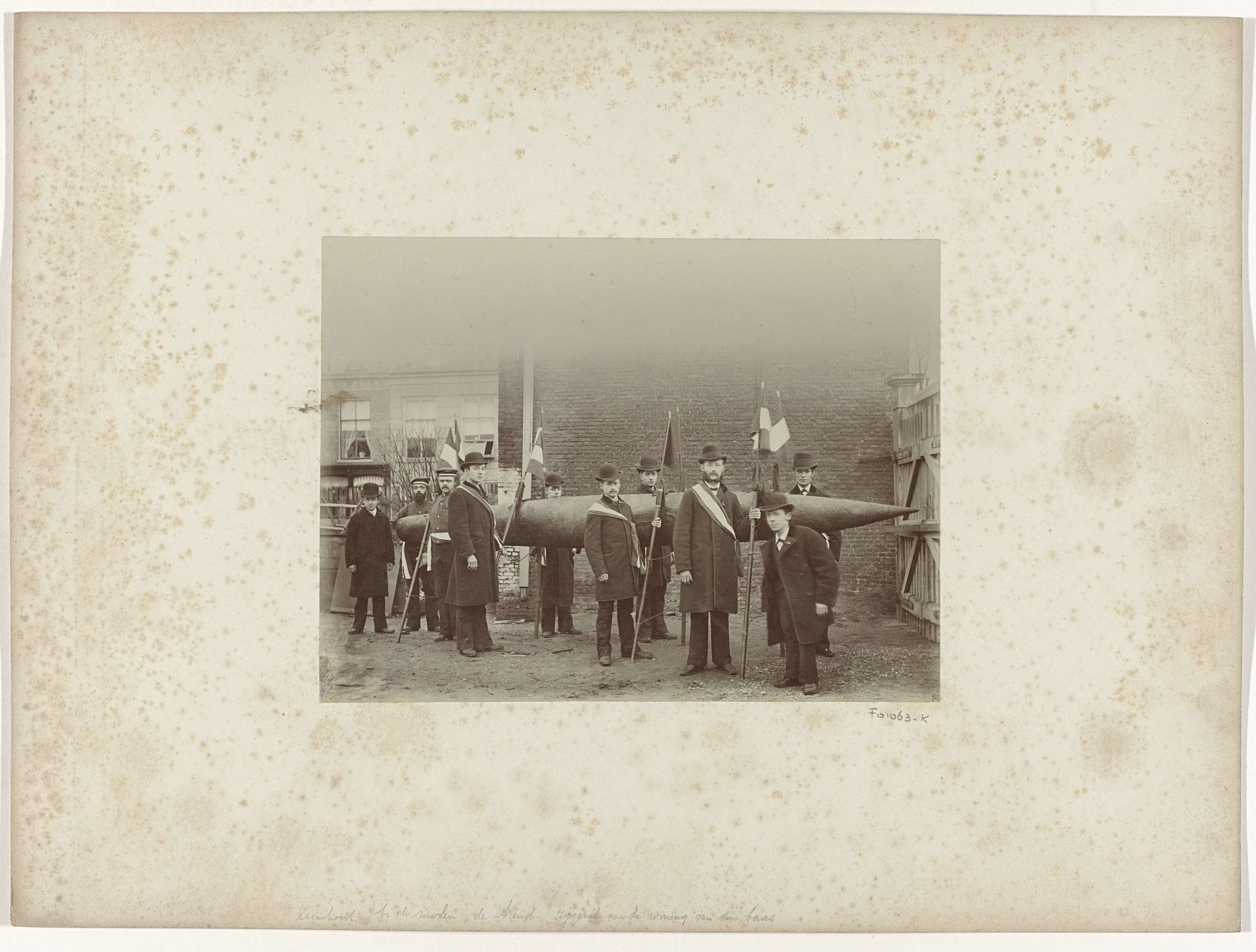 Mannen met vlaggen bij de 6 meter lange Oranjesigaar...
