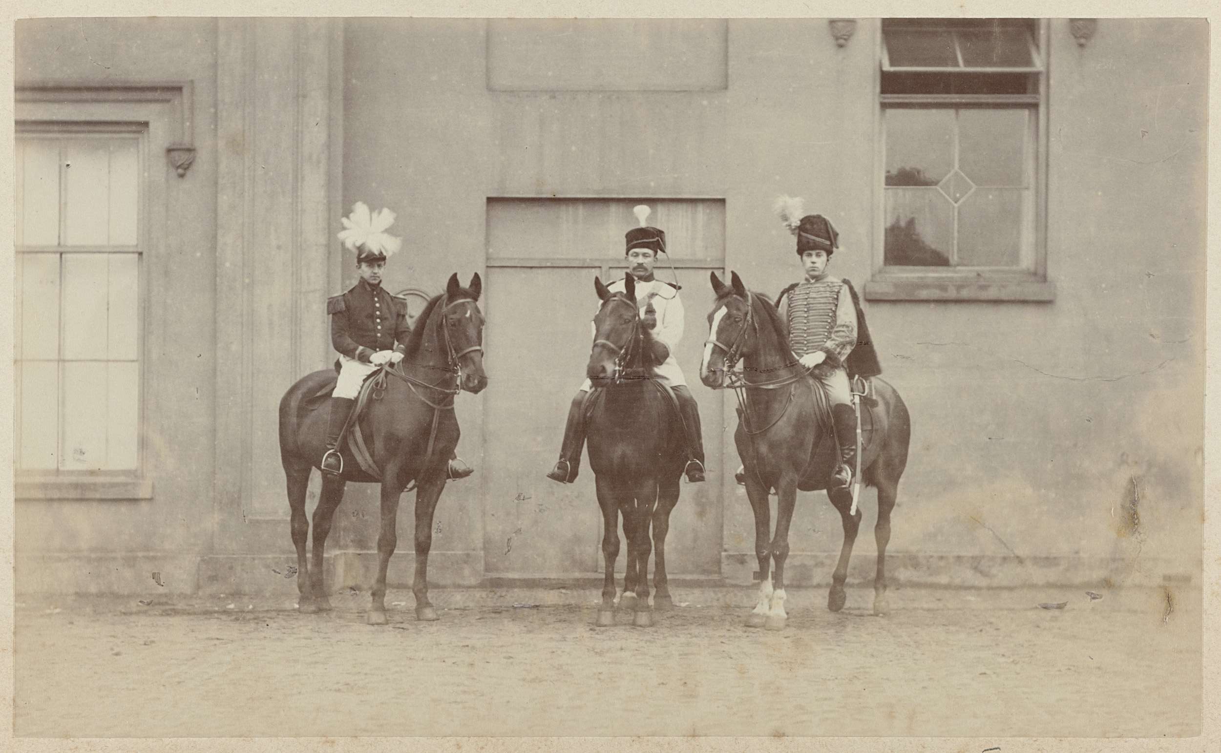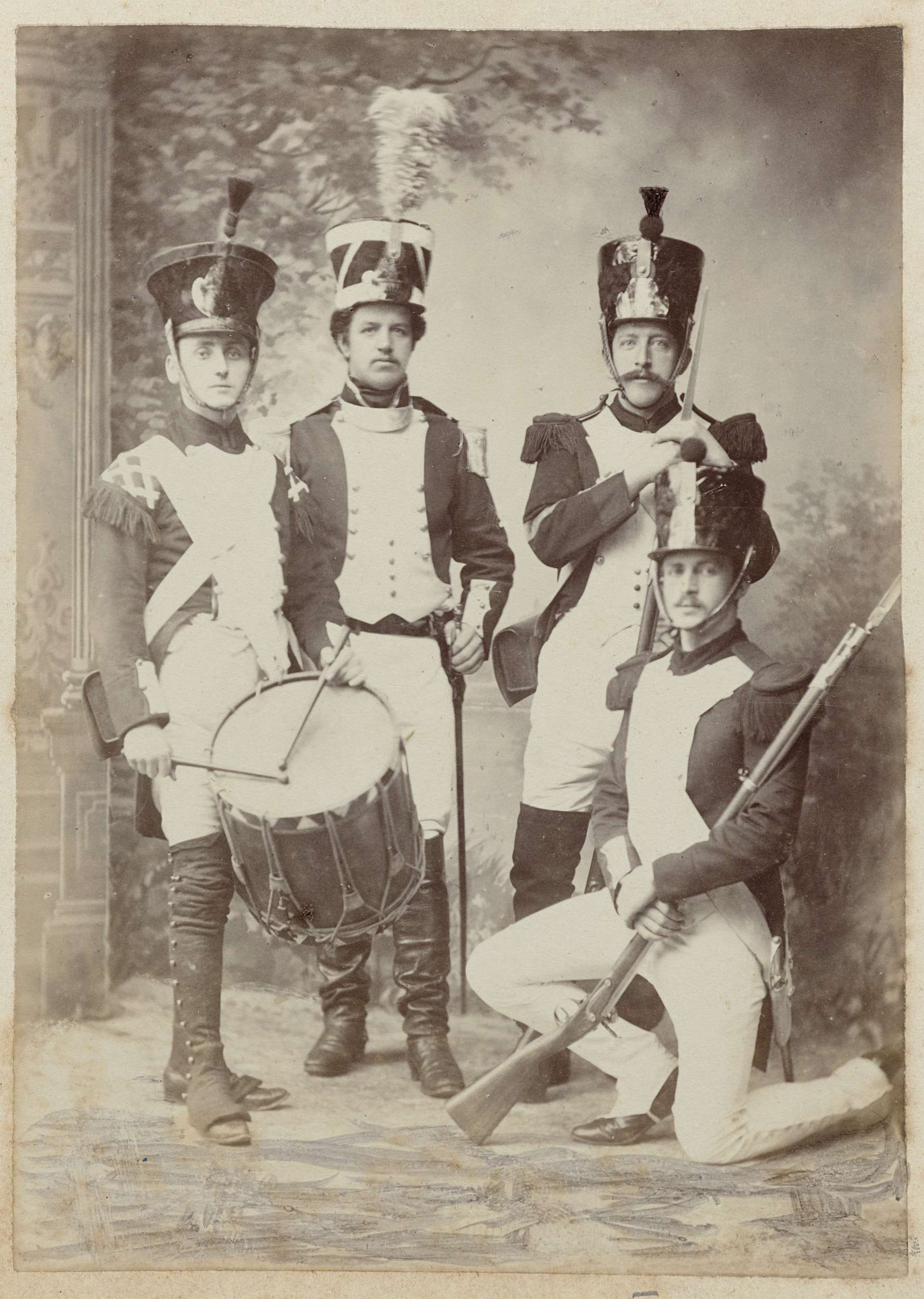 Groepsportret van drie onbekende mannen in historisc...