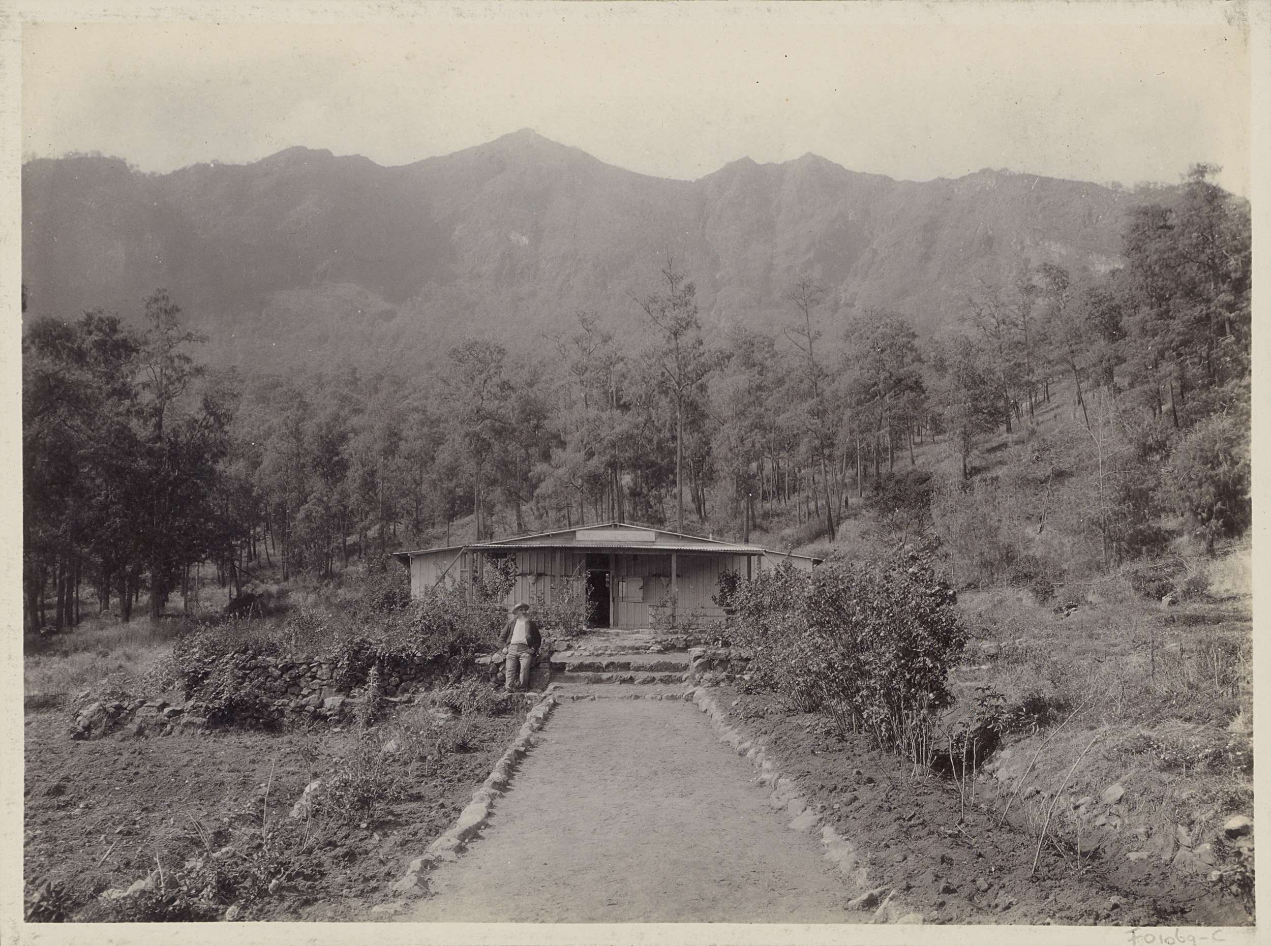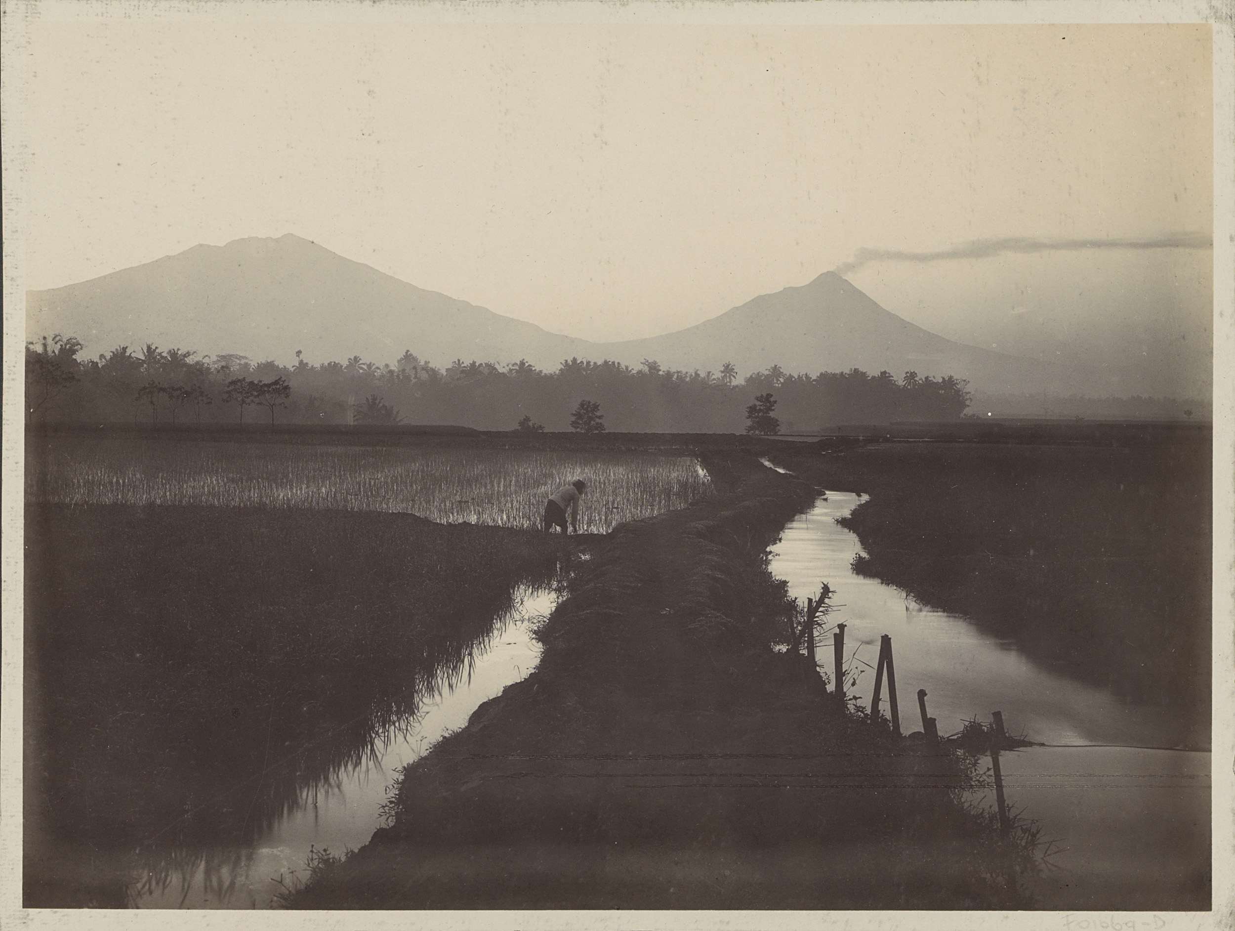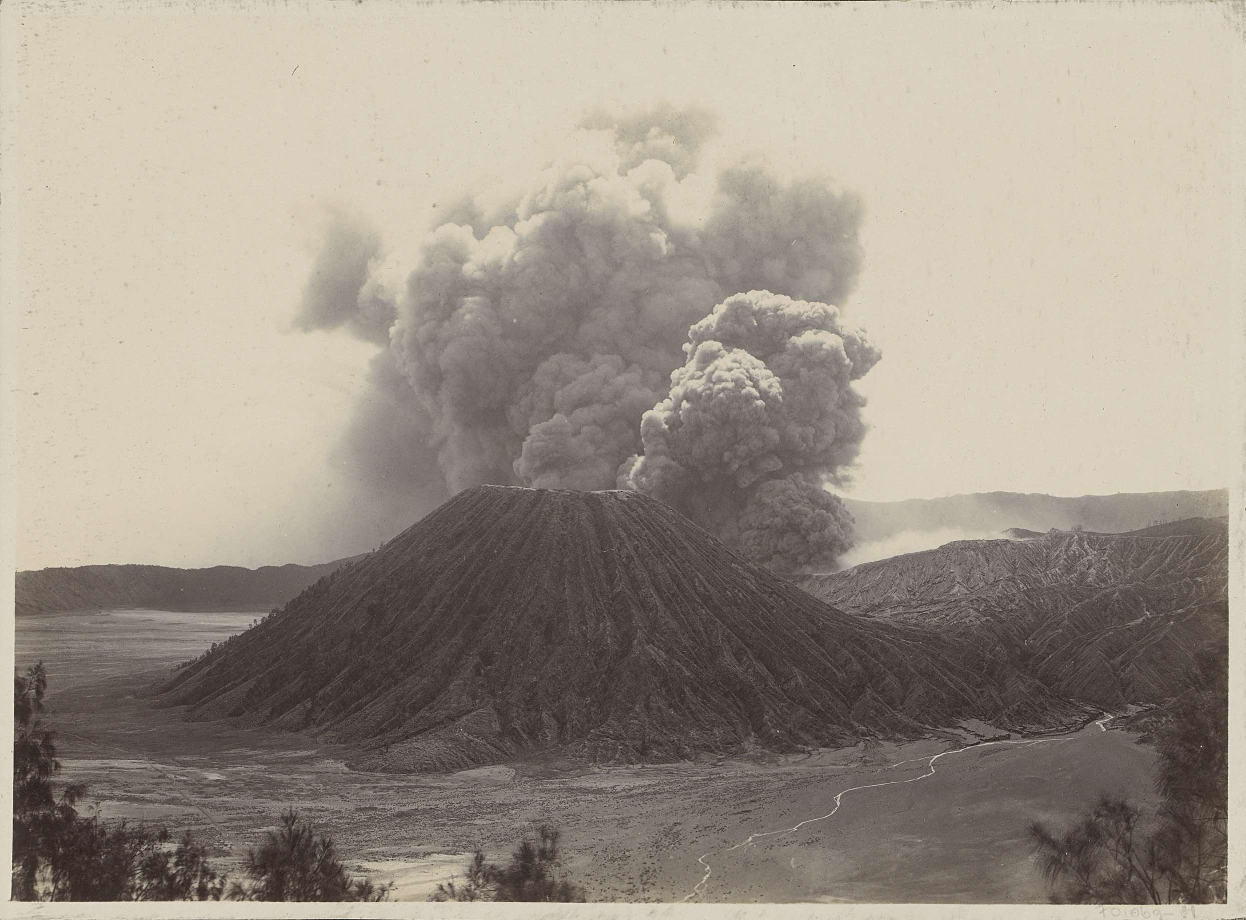 Man met paard bij een rokende vulkaan in Nederlands-...