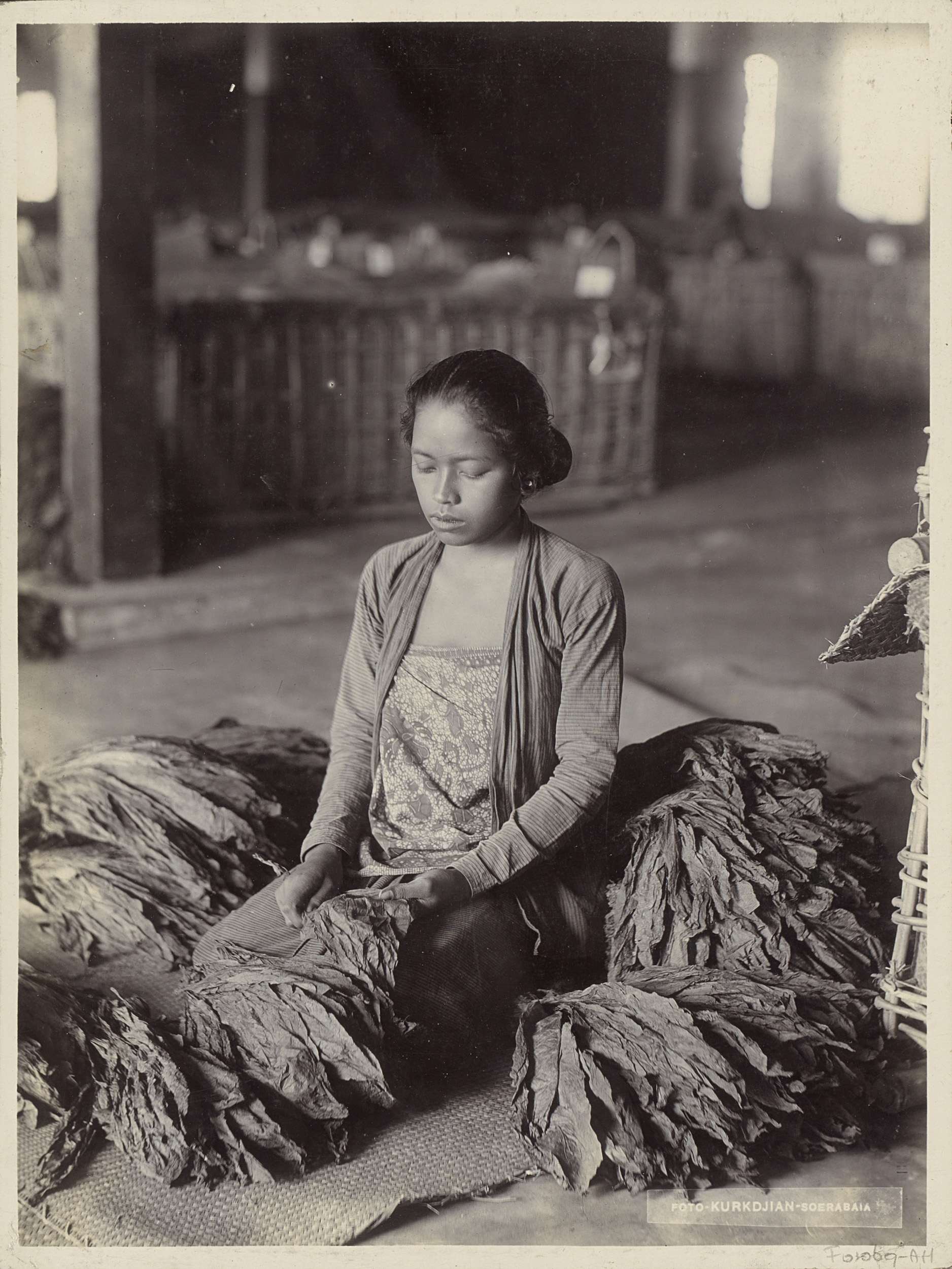 Vrouw sorteert tabaksbladen in Nederlands-Indië