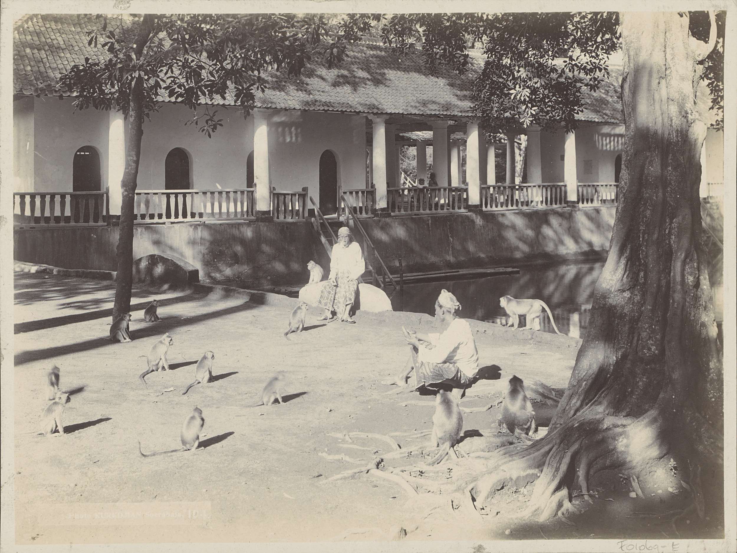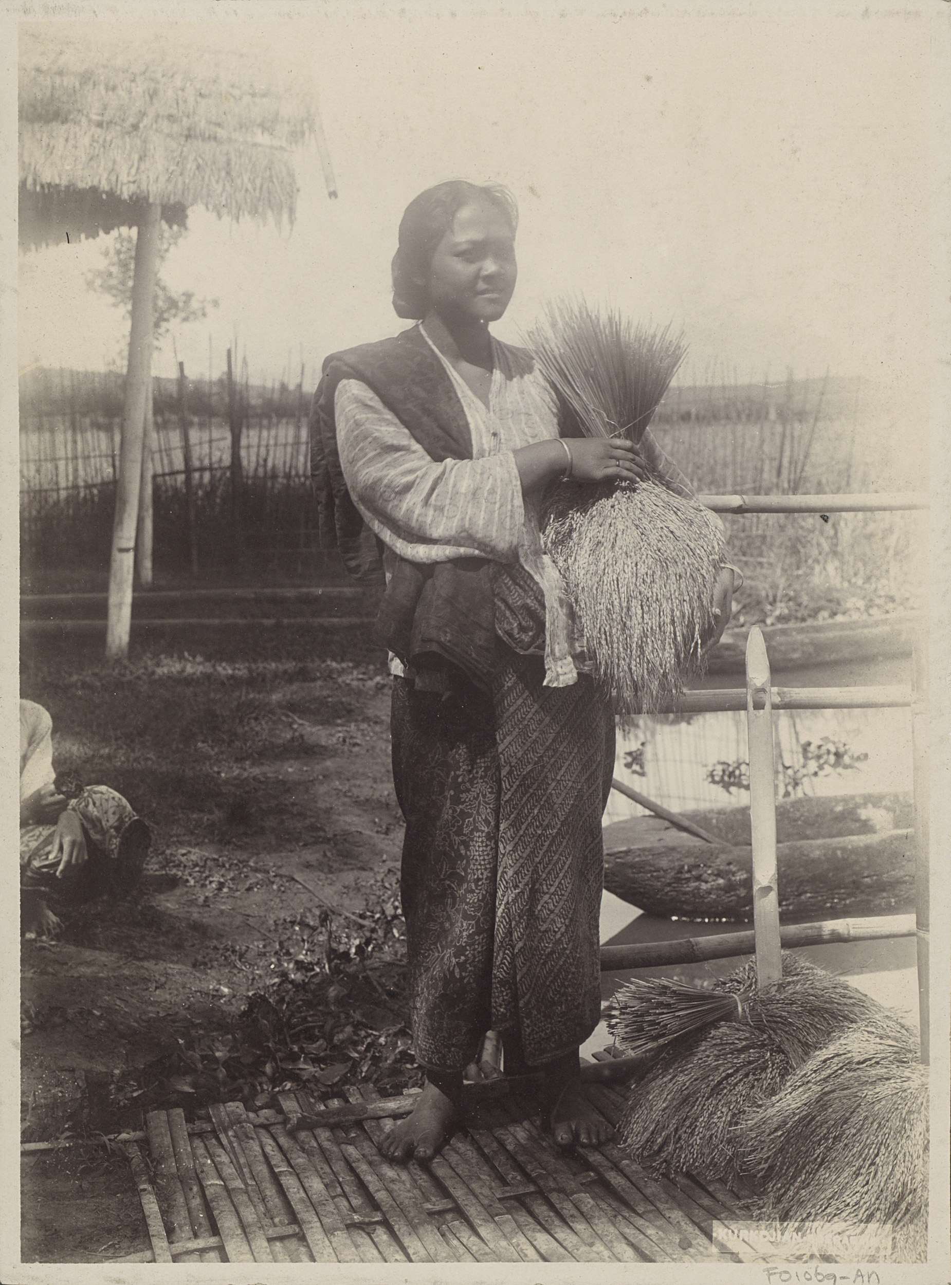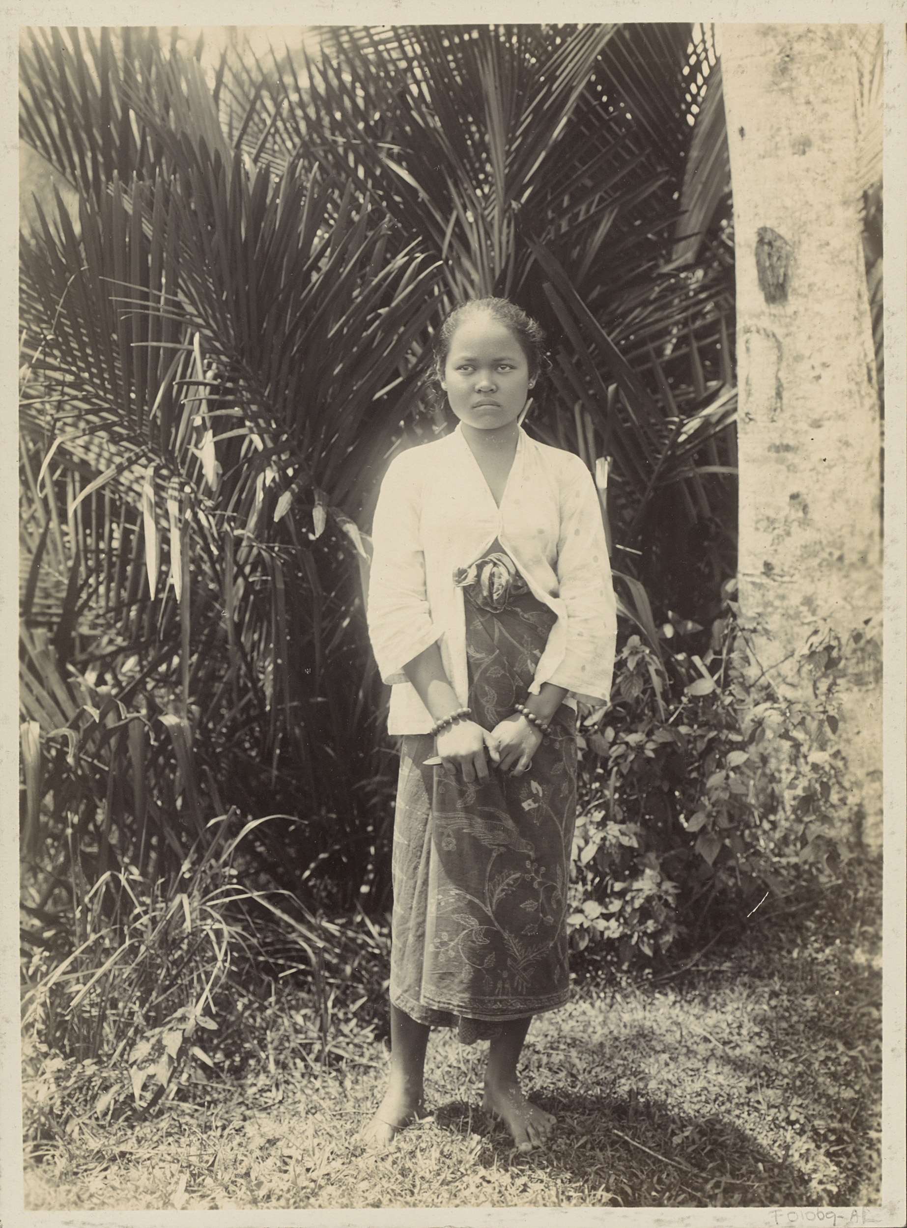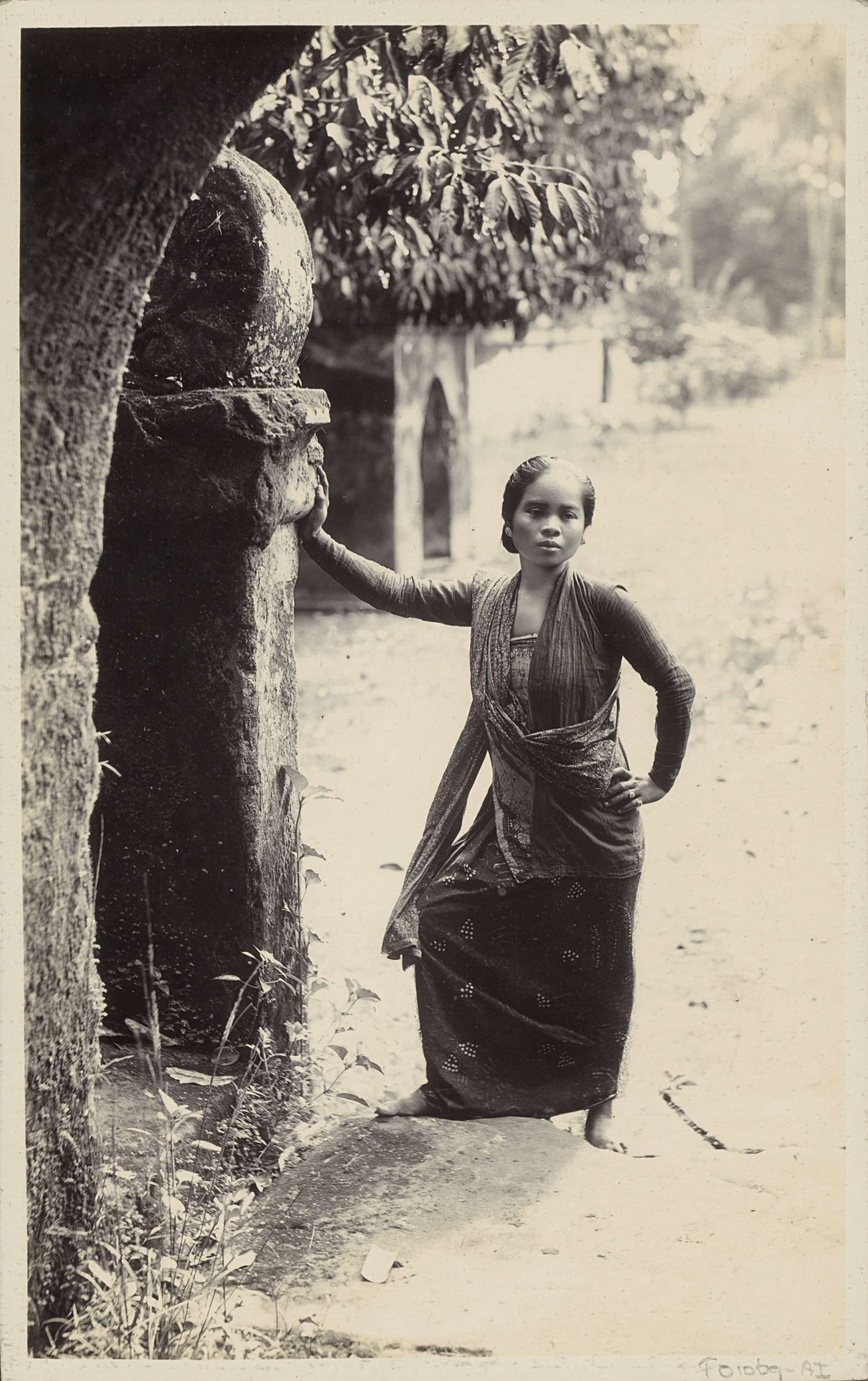 Jonge vrouw staand bij een boom in Nederlands-Indië
