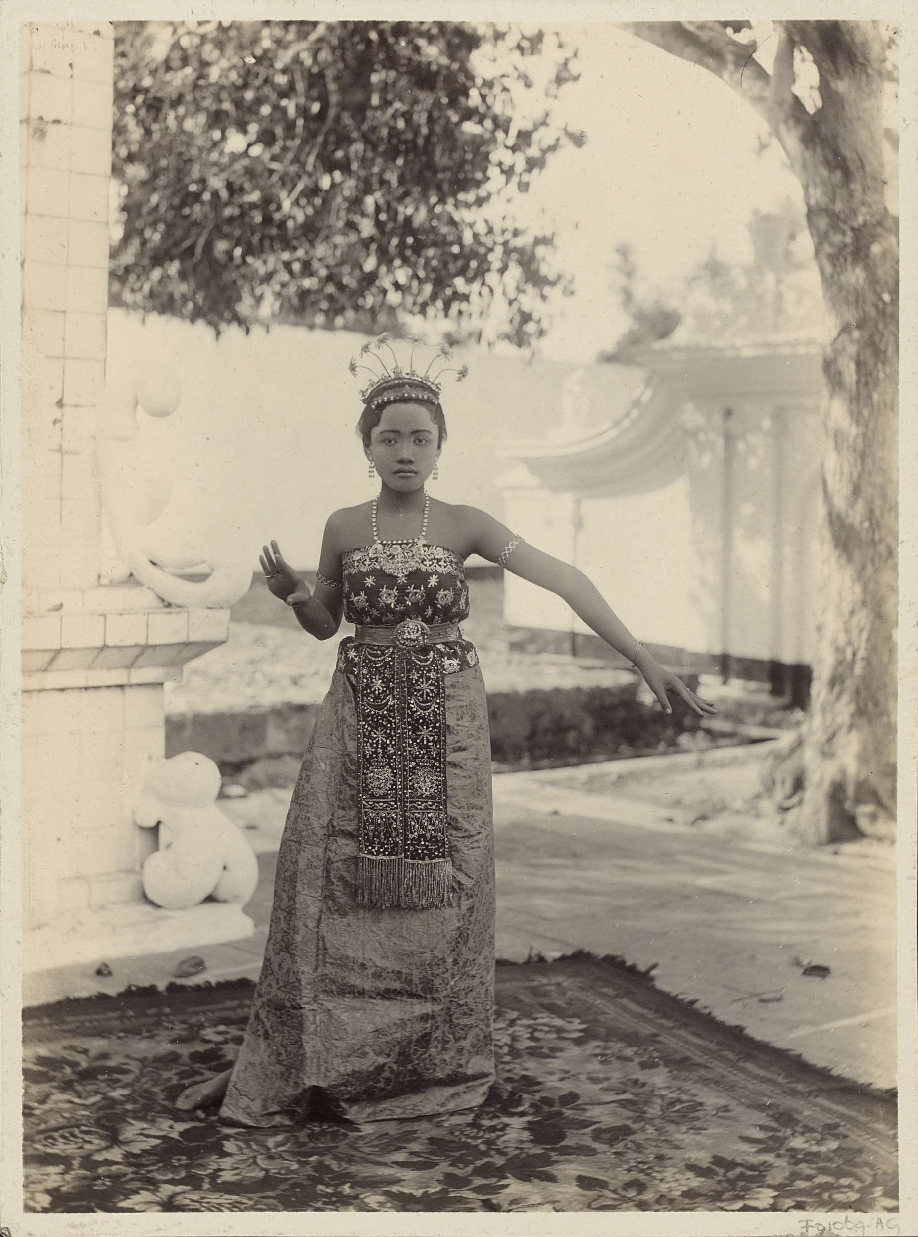 Danseres buiten op een kleed in Nederlands-Indië