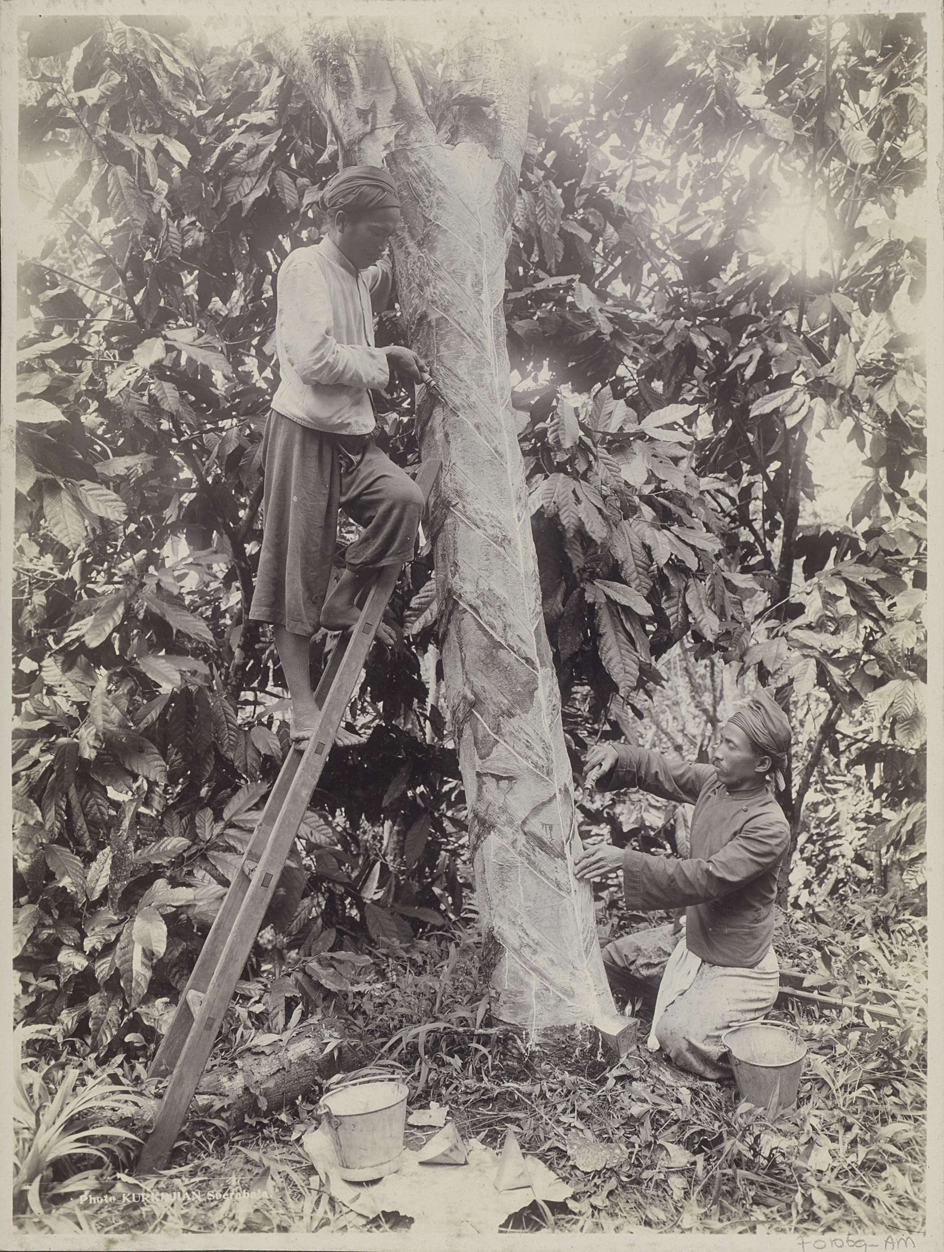 Rubbertappers kerven boom in Nederlands-Indië