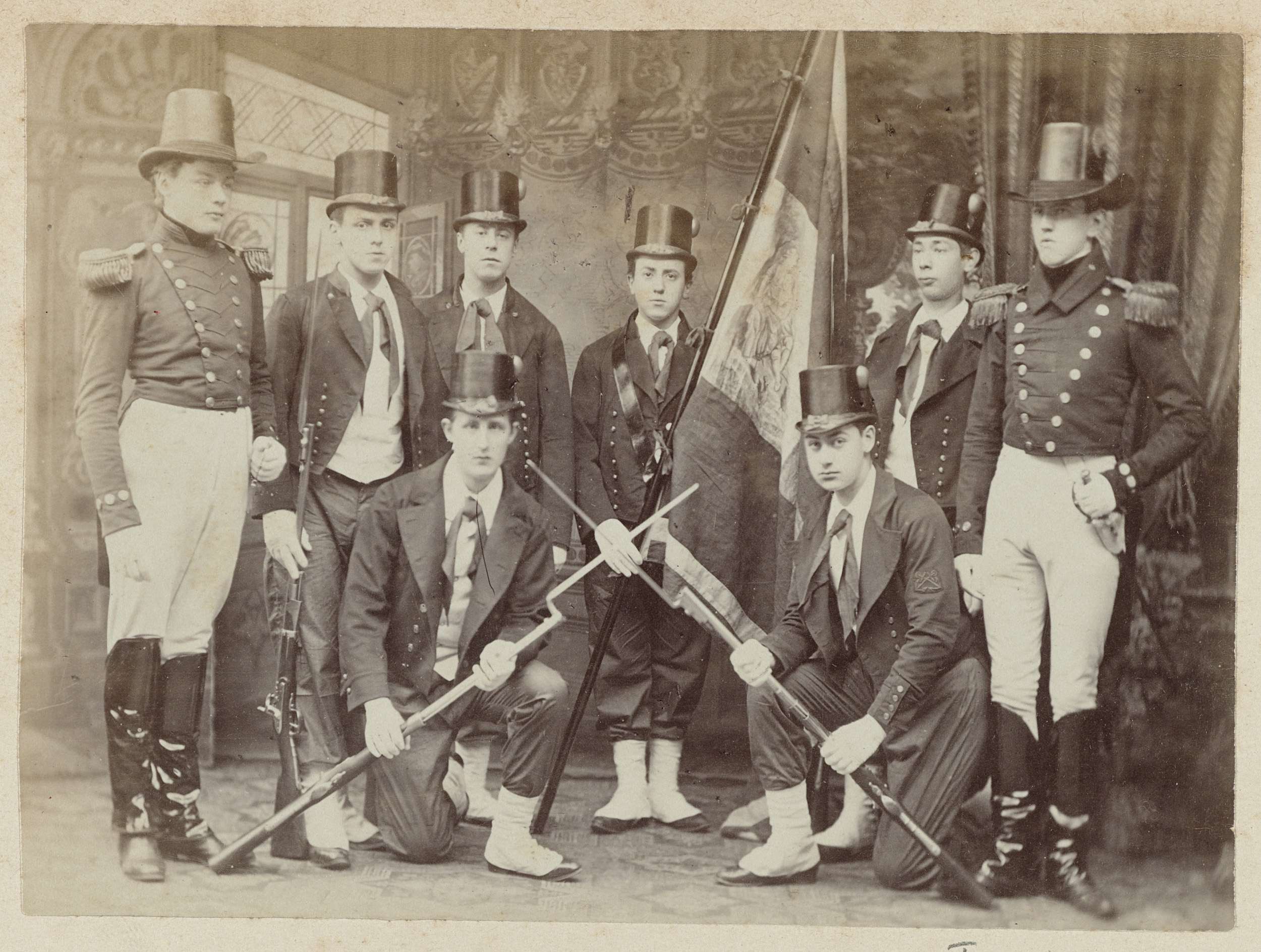 Groepsportret van acht onbekende mannen in historisc...