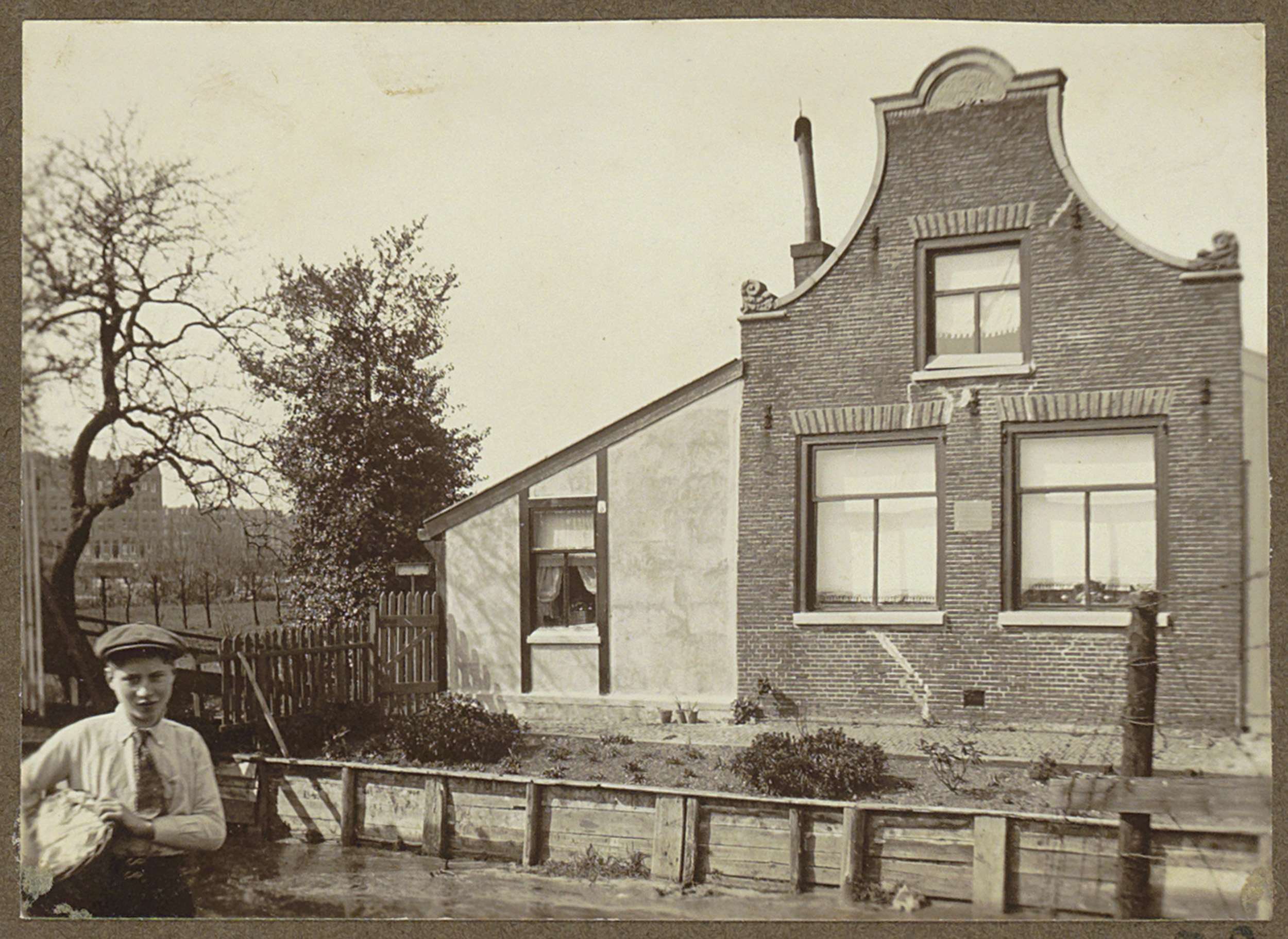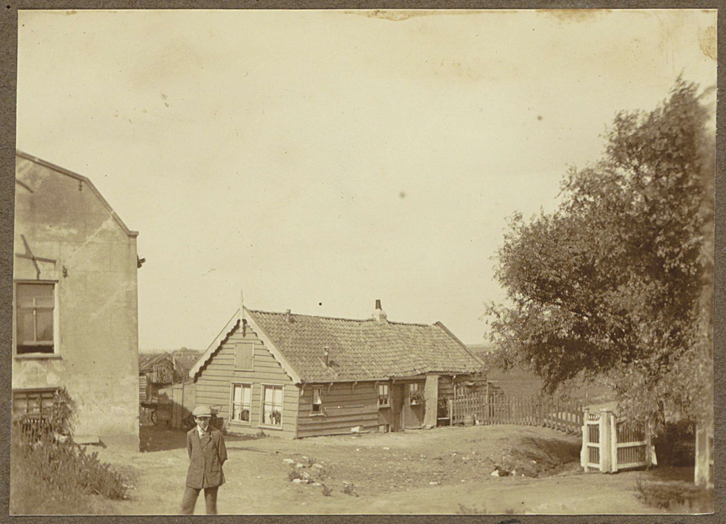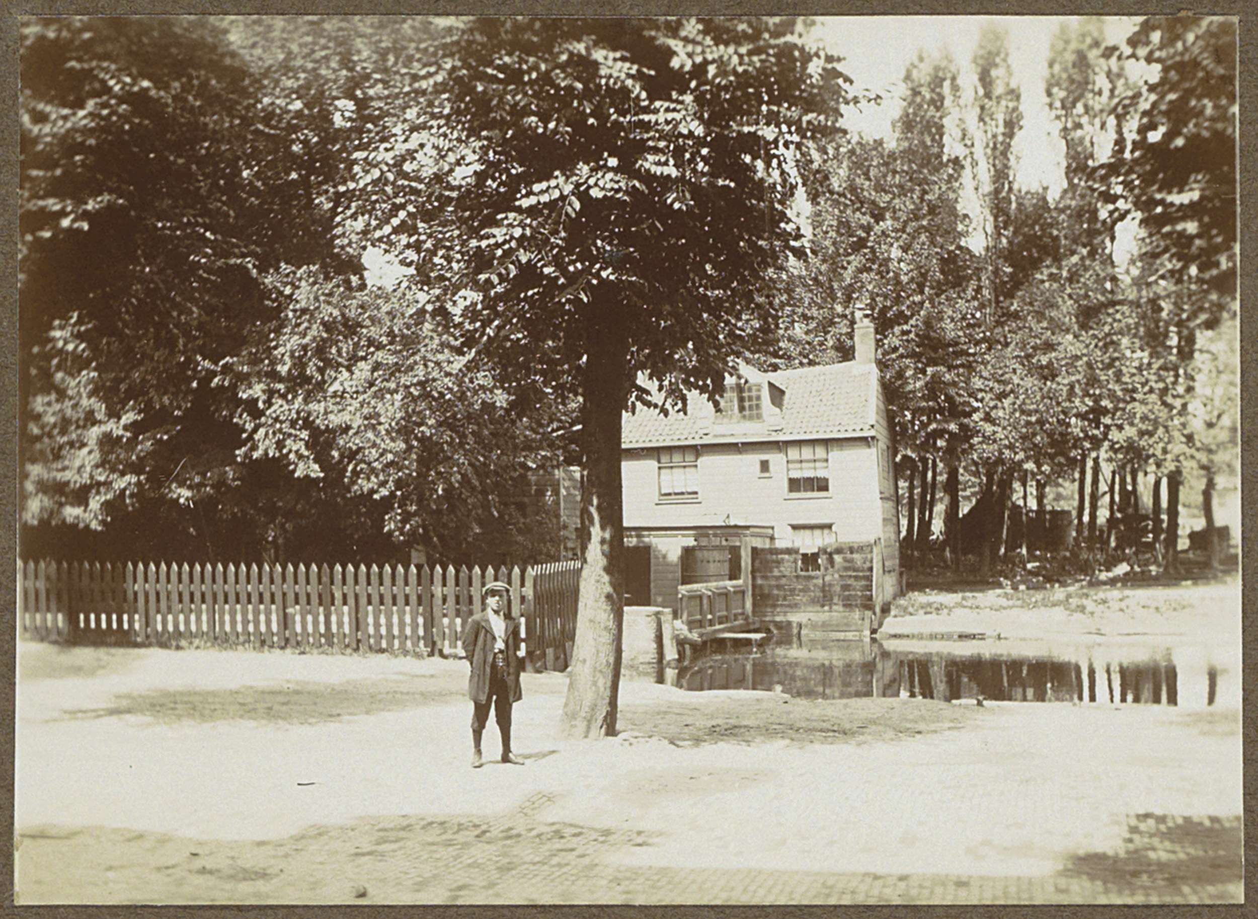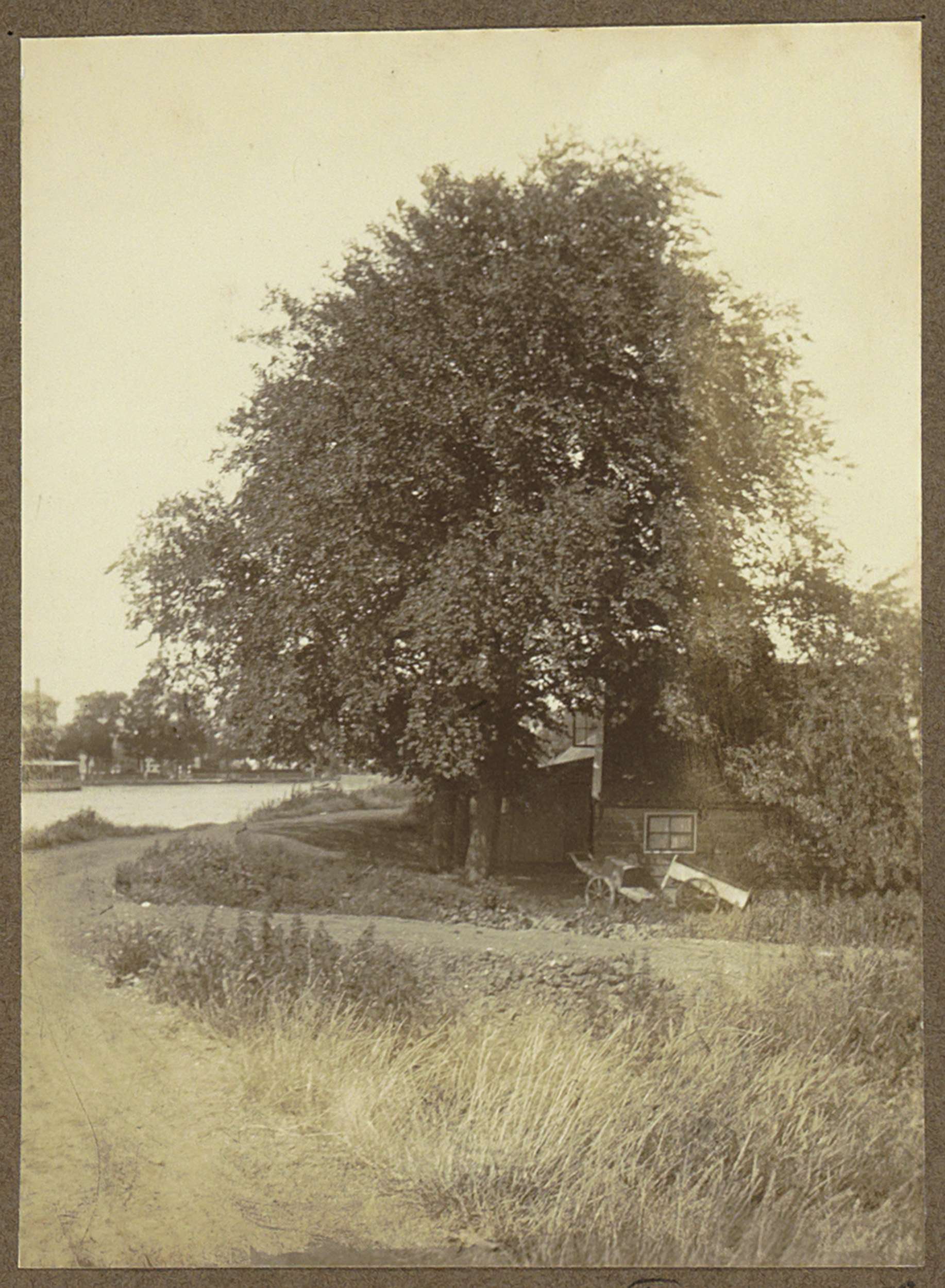 Huis en een handkar onder een boom aan de Amstel