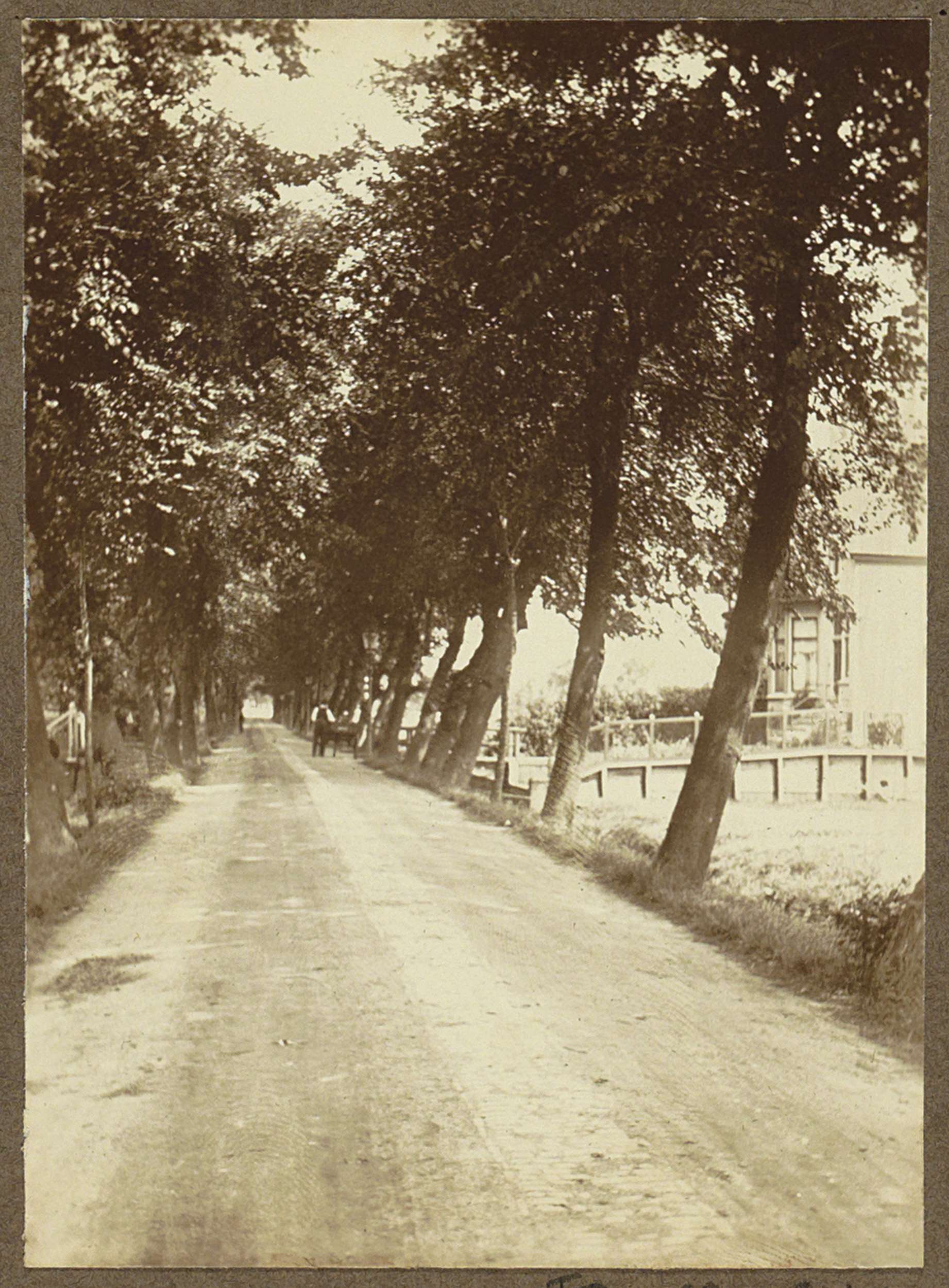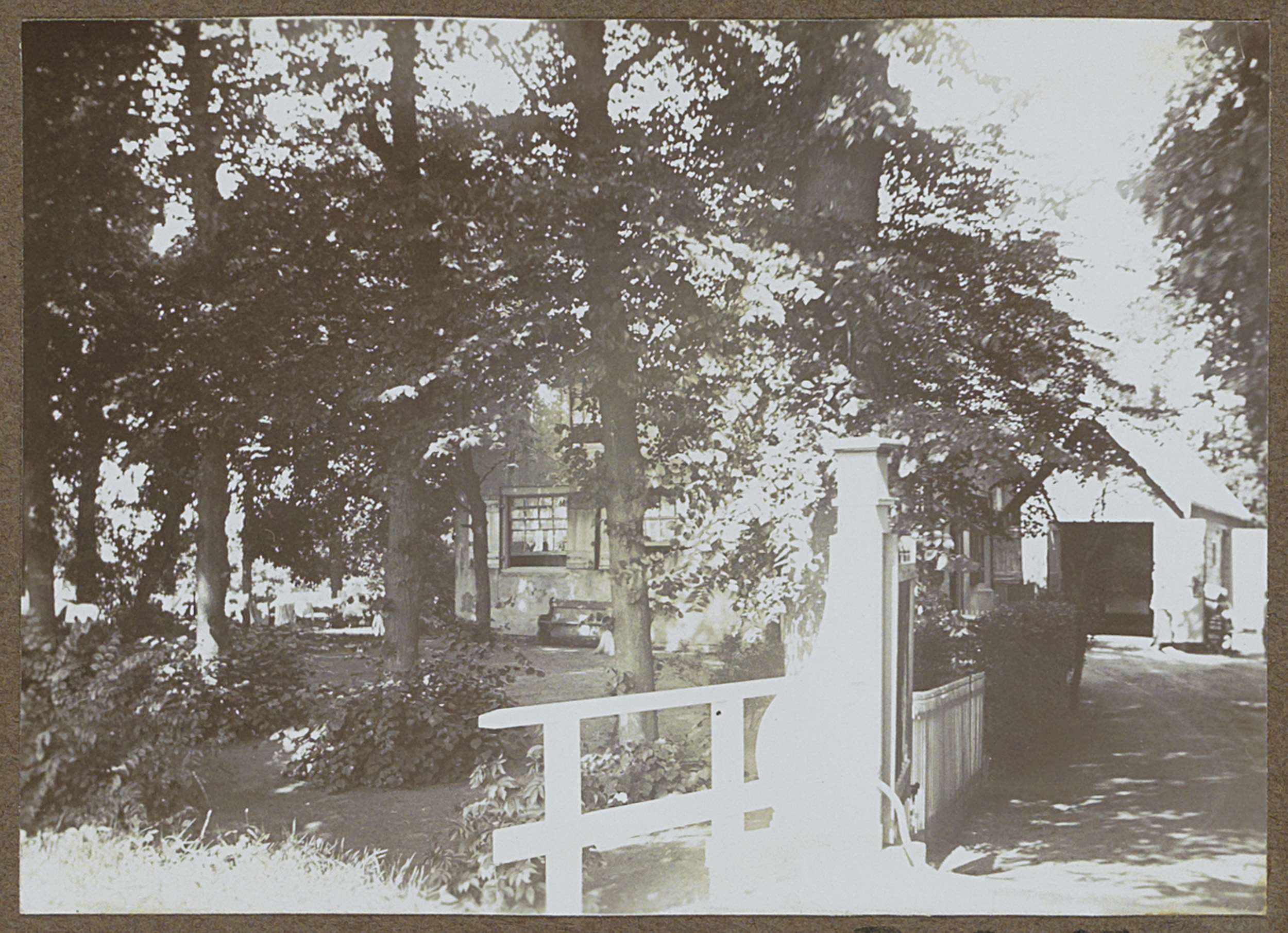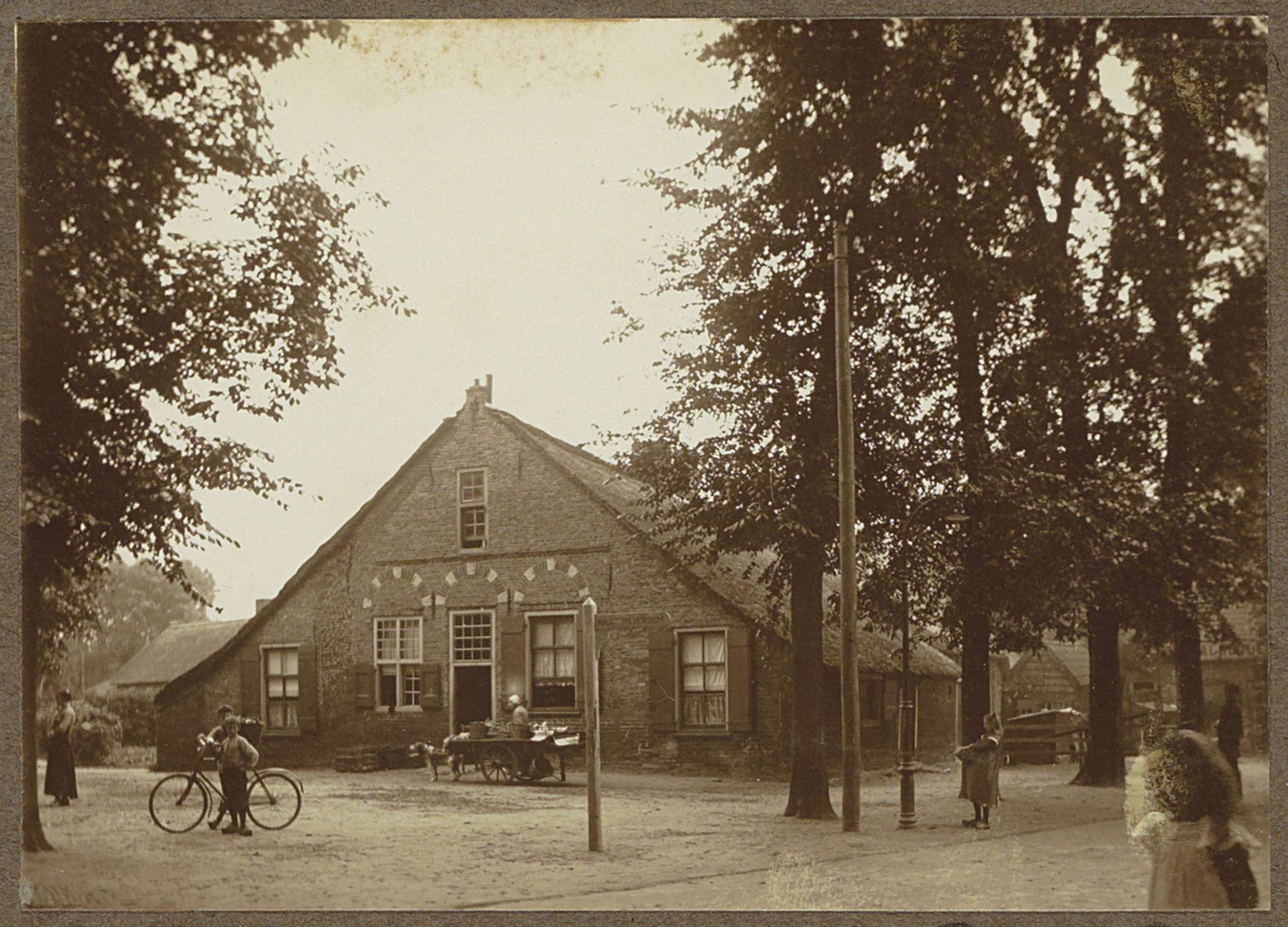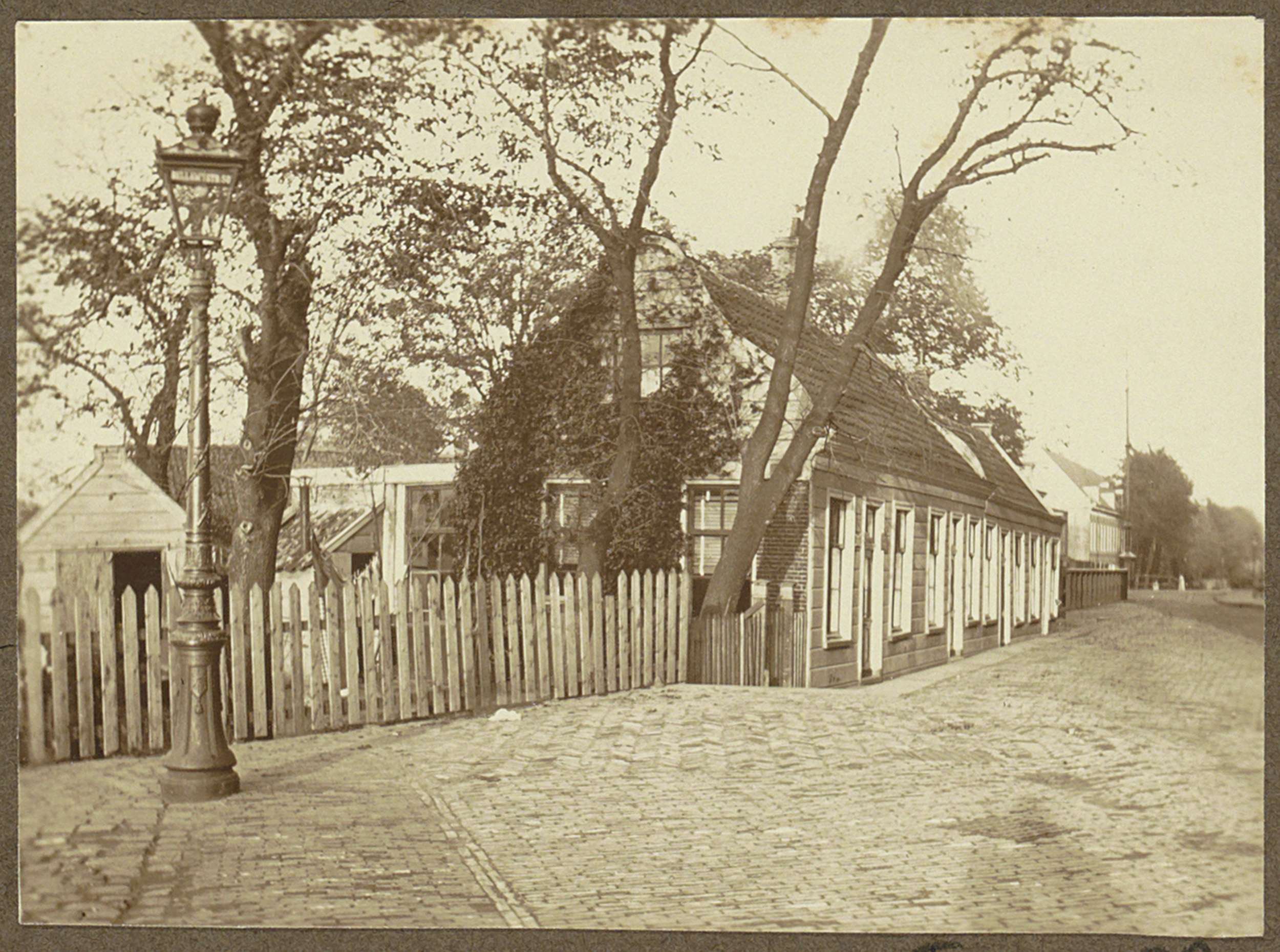Huis en een handkar onder een boom aan de Amstel