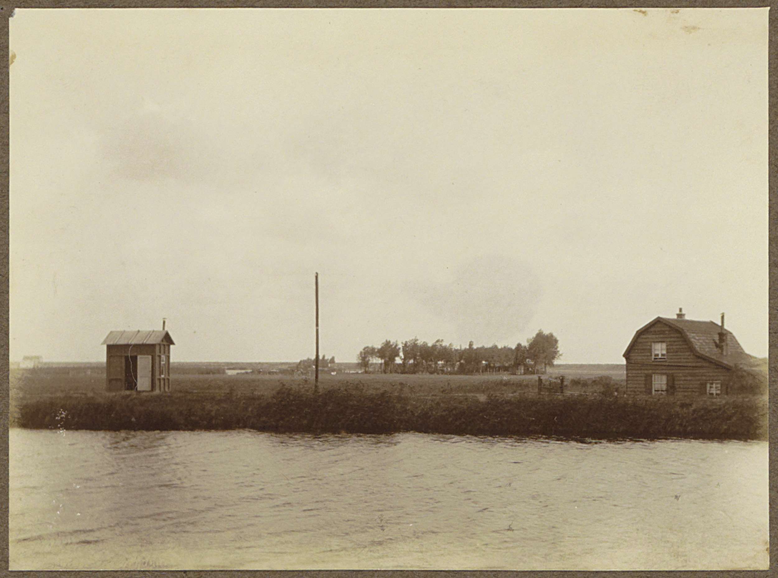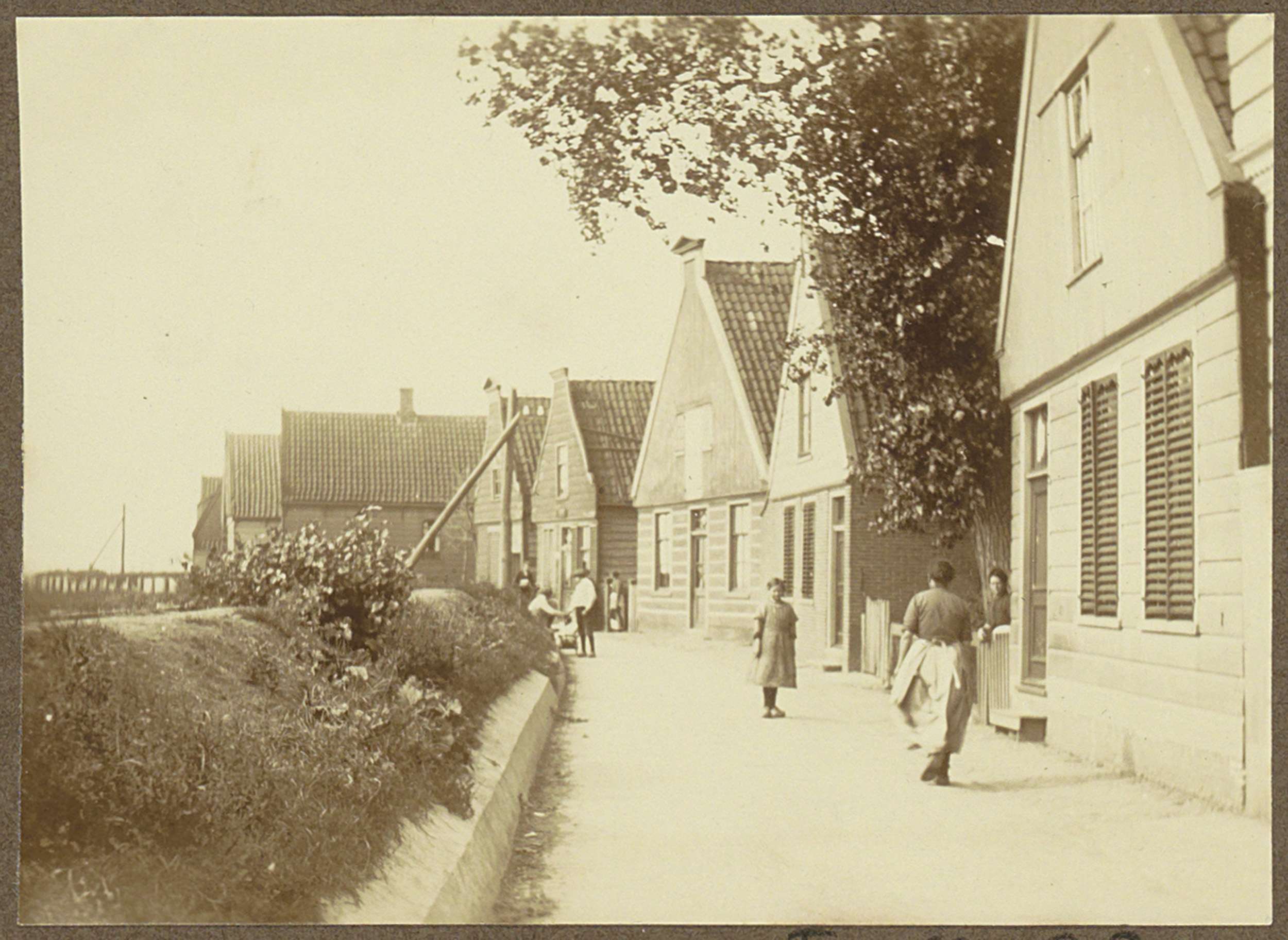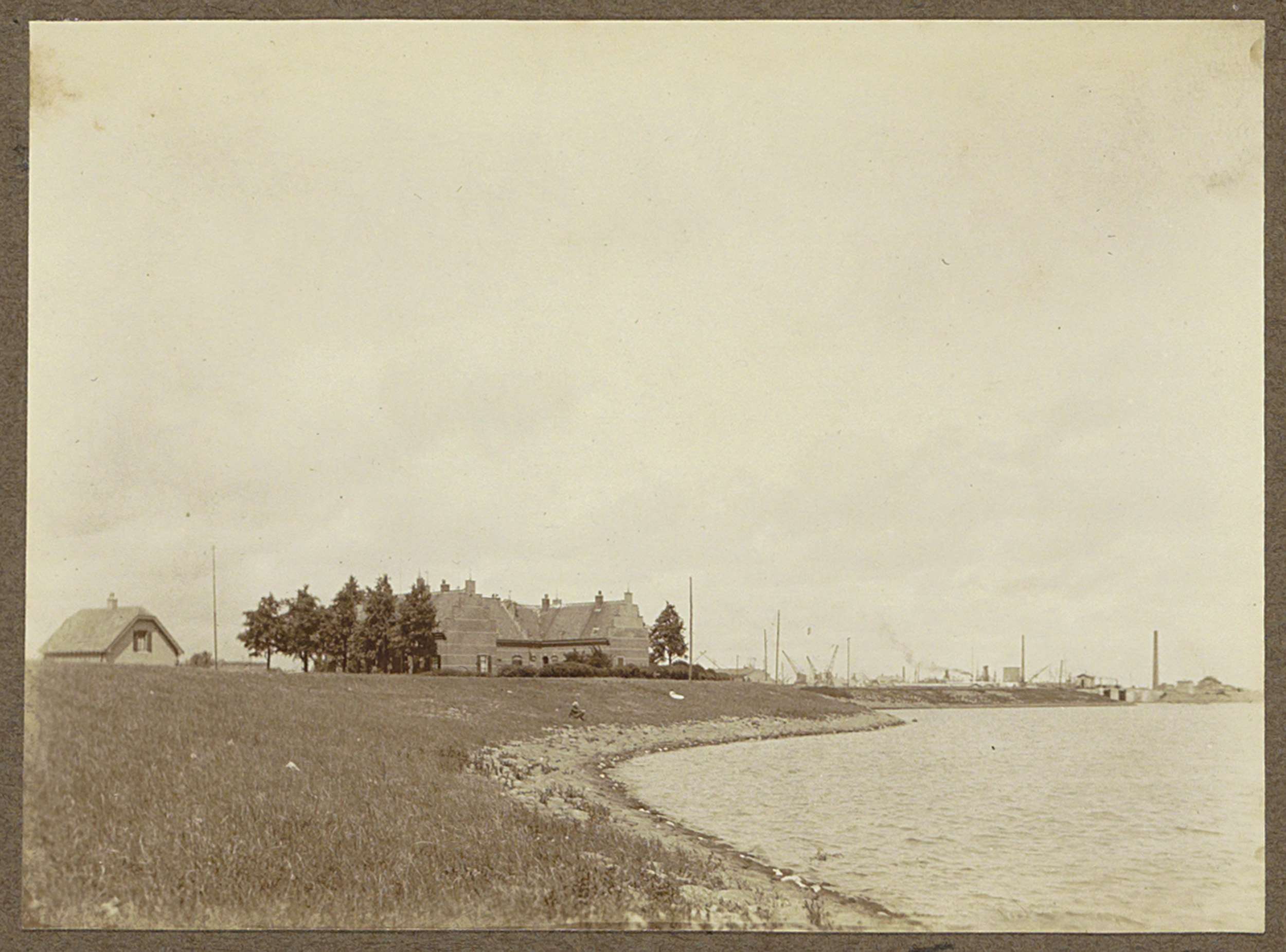 Huizen op een dijk bij Zeeburg, aan de horizon graaf...