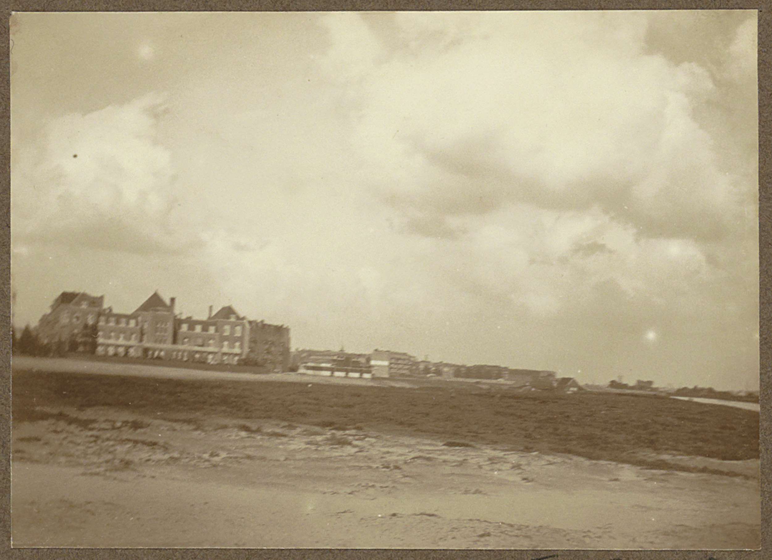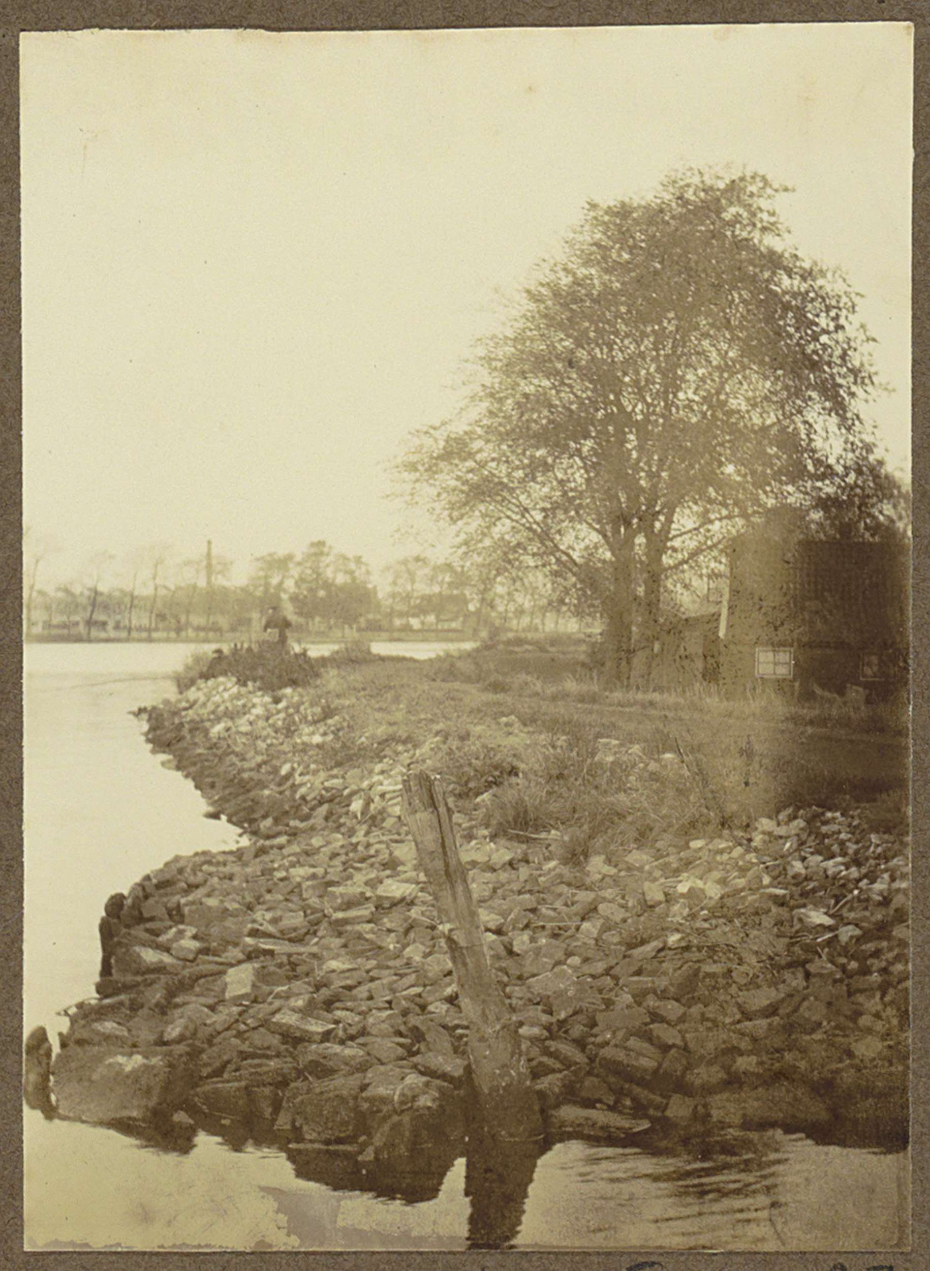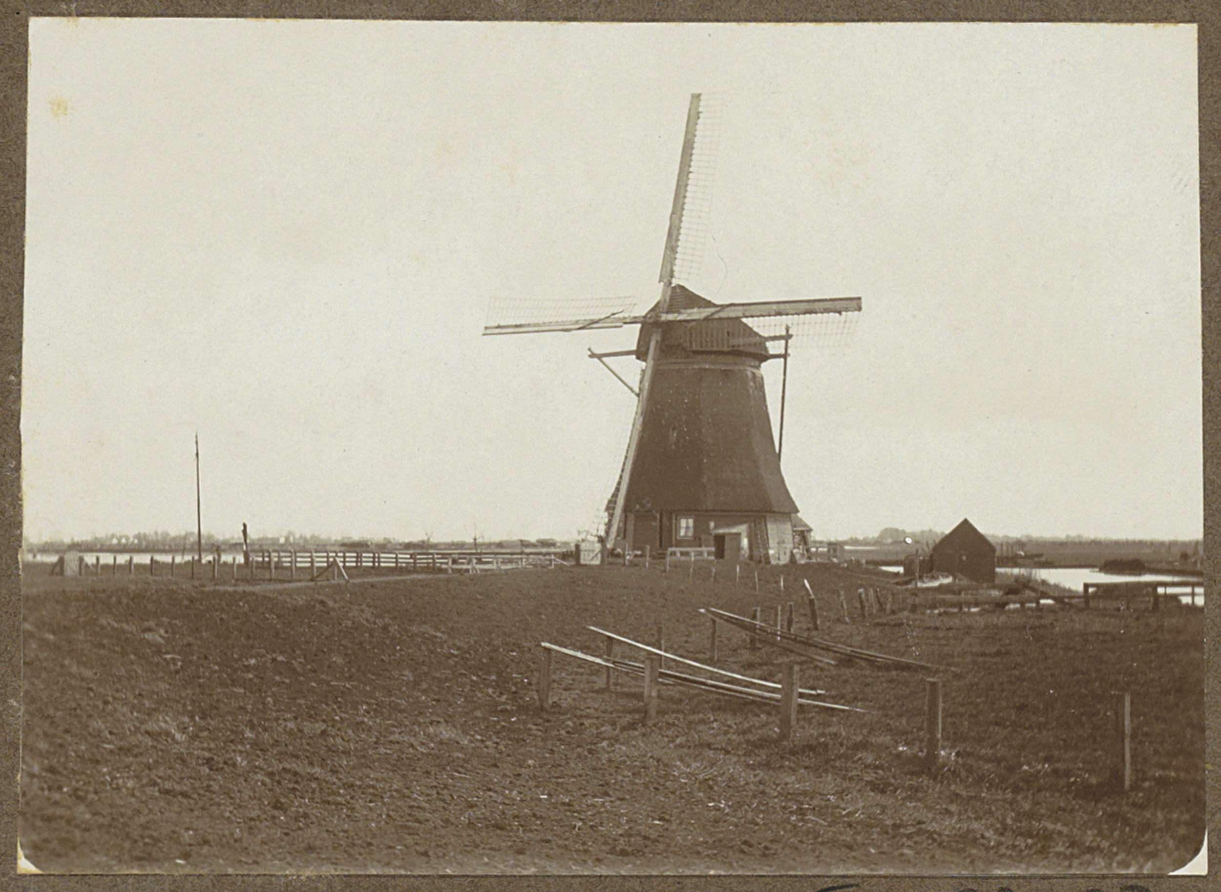 Huizen op een dijk bij Zeeburg, aan de horizon graaf...