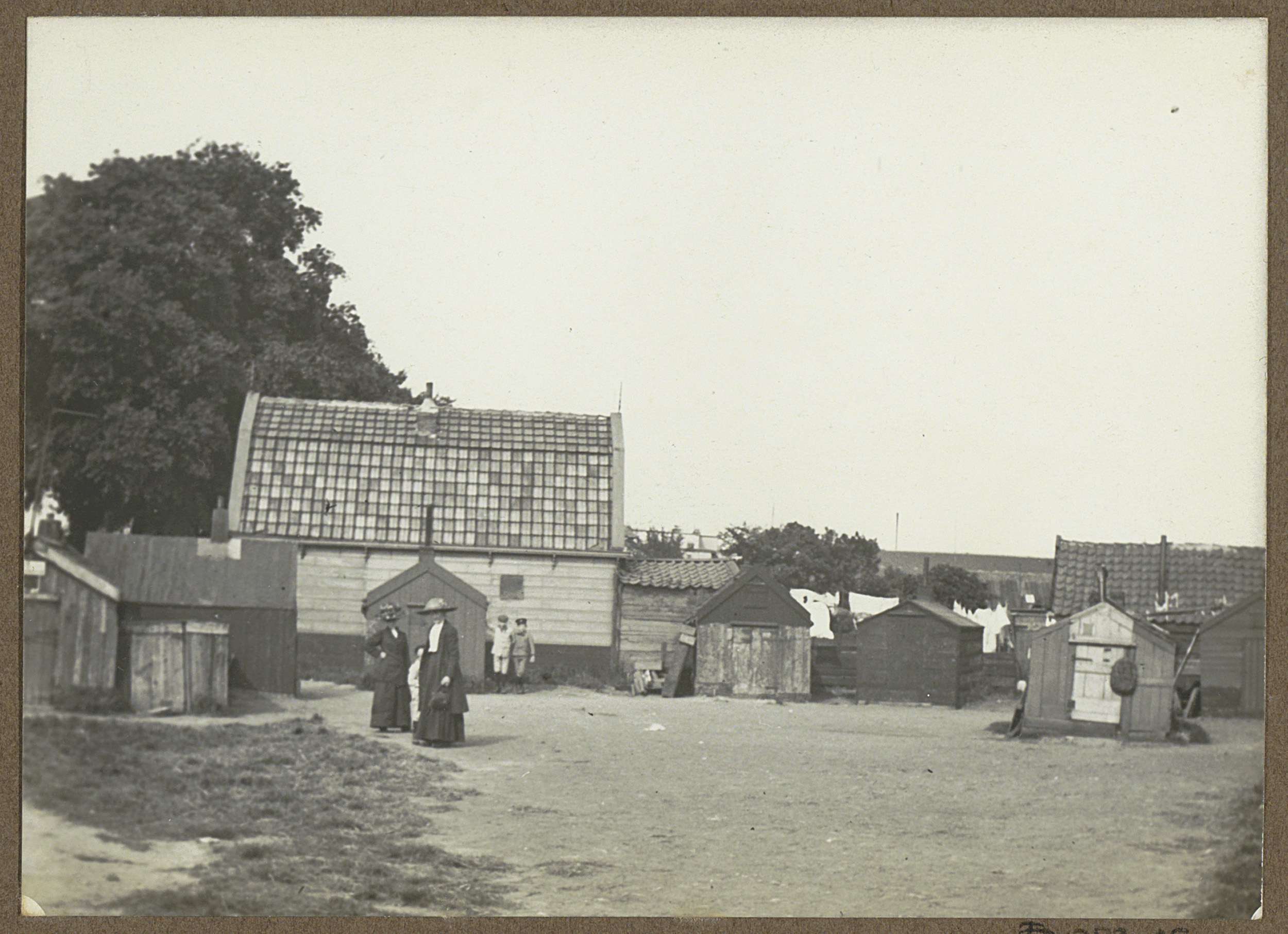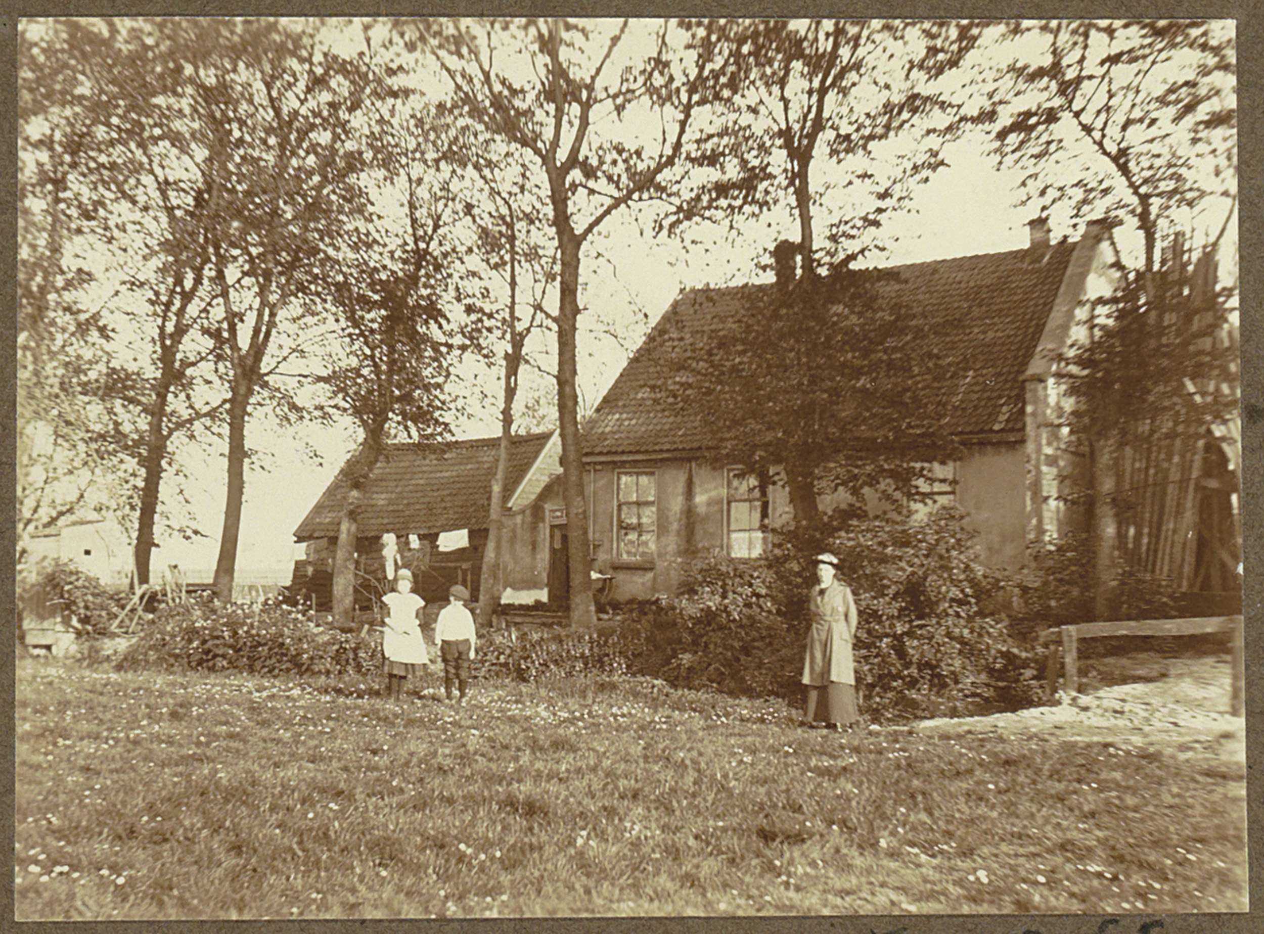 Vrouw en twee kinderen bij een huisje, in de buurt v...