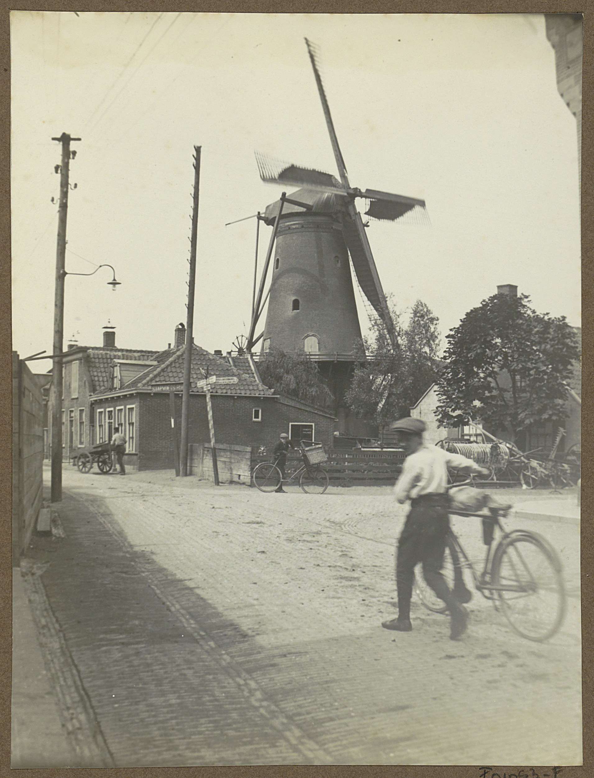Dorpsstraat met fietser en windmolen bij Weesp