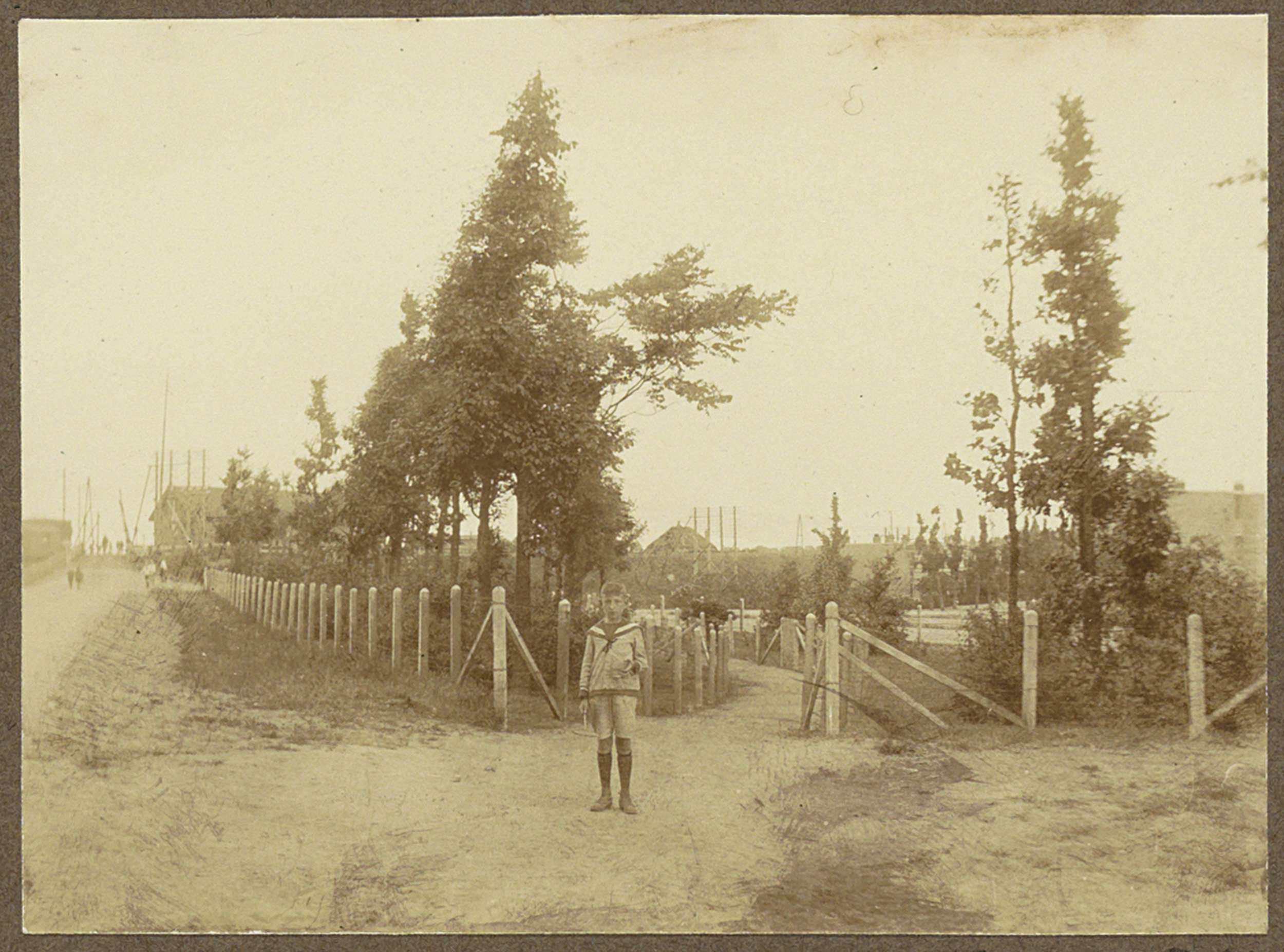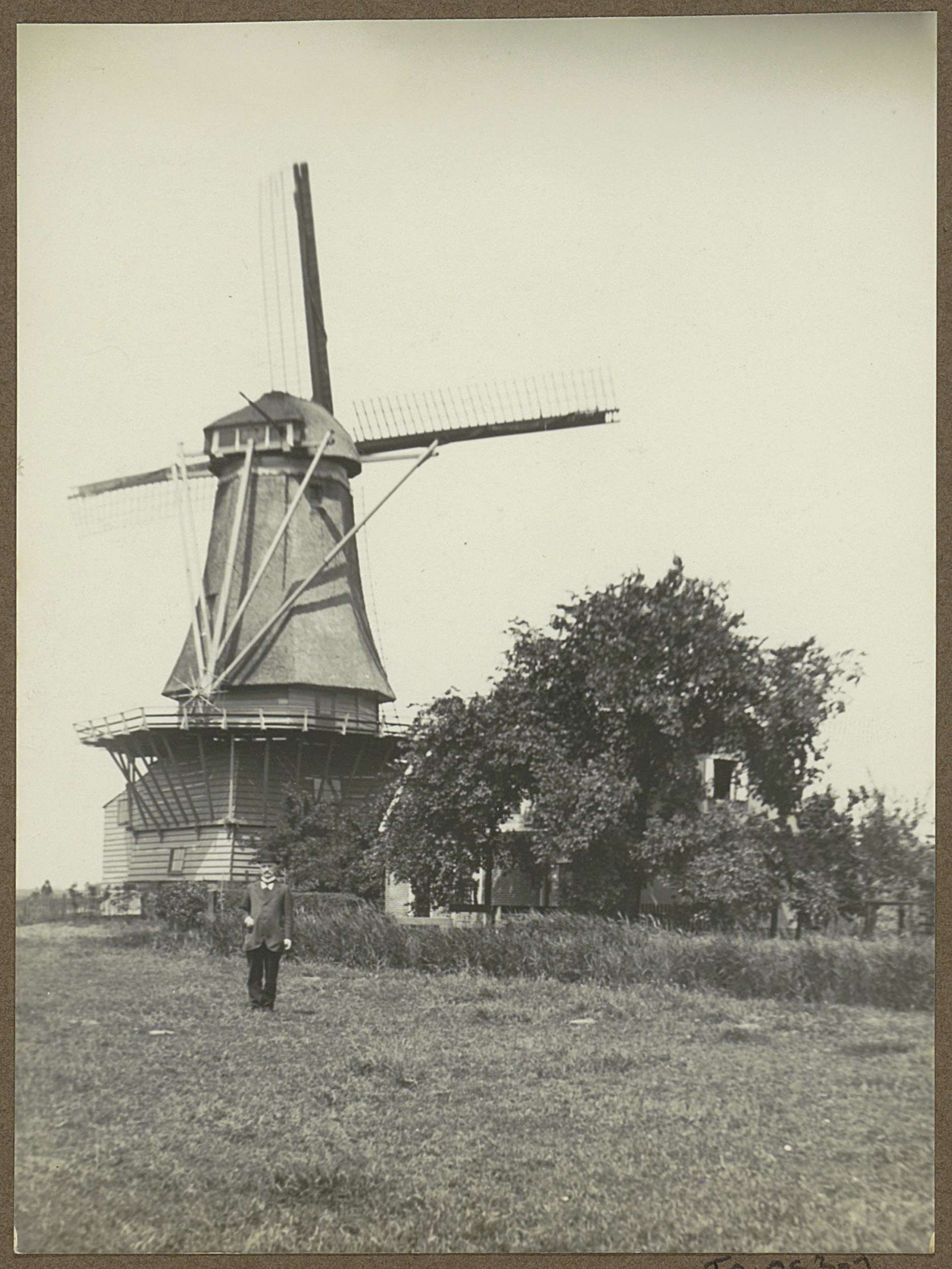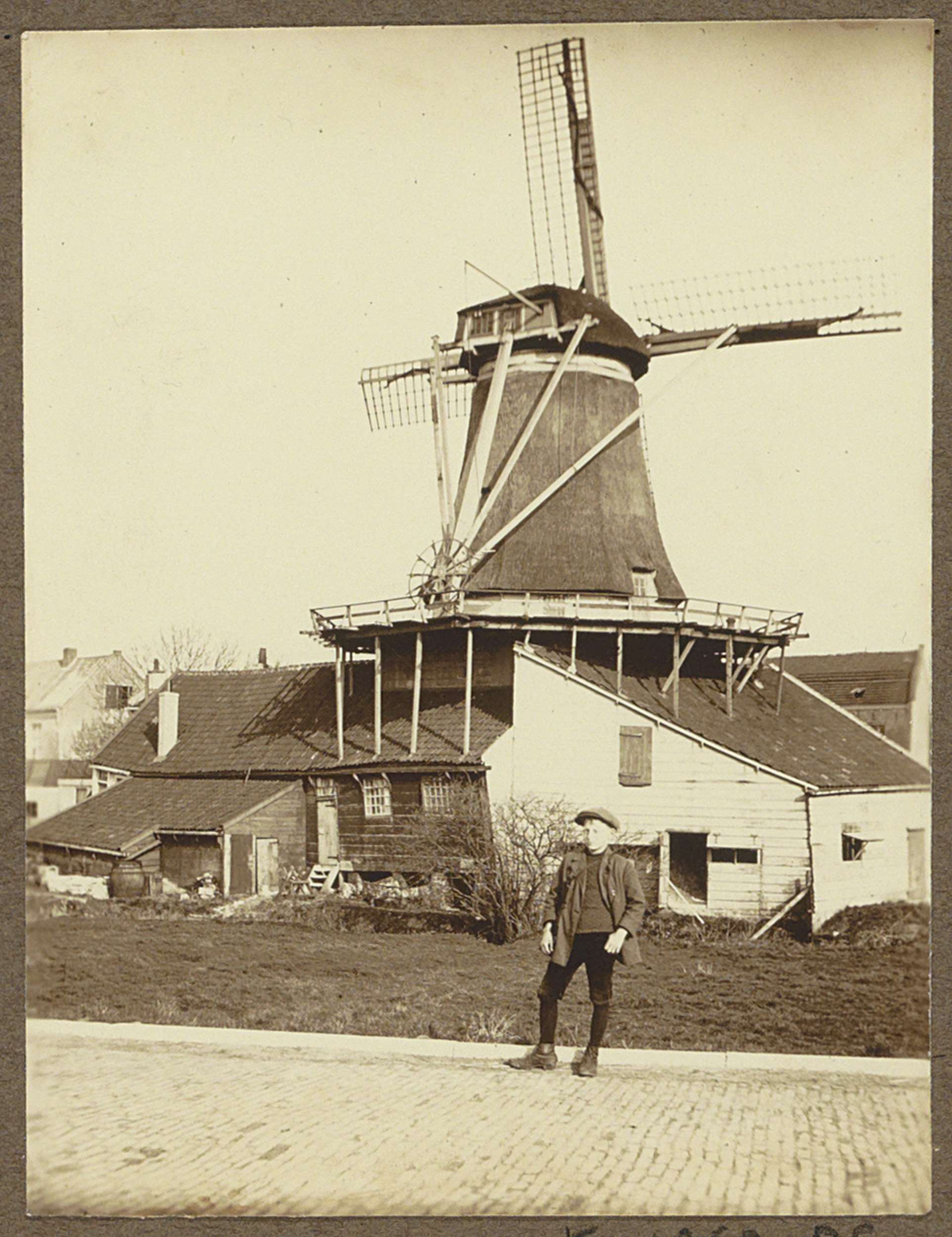 Jongen poserend voor krijtmolen De Hoop aan de Baars...