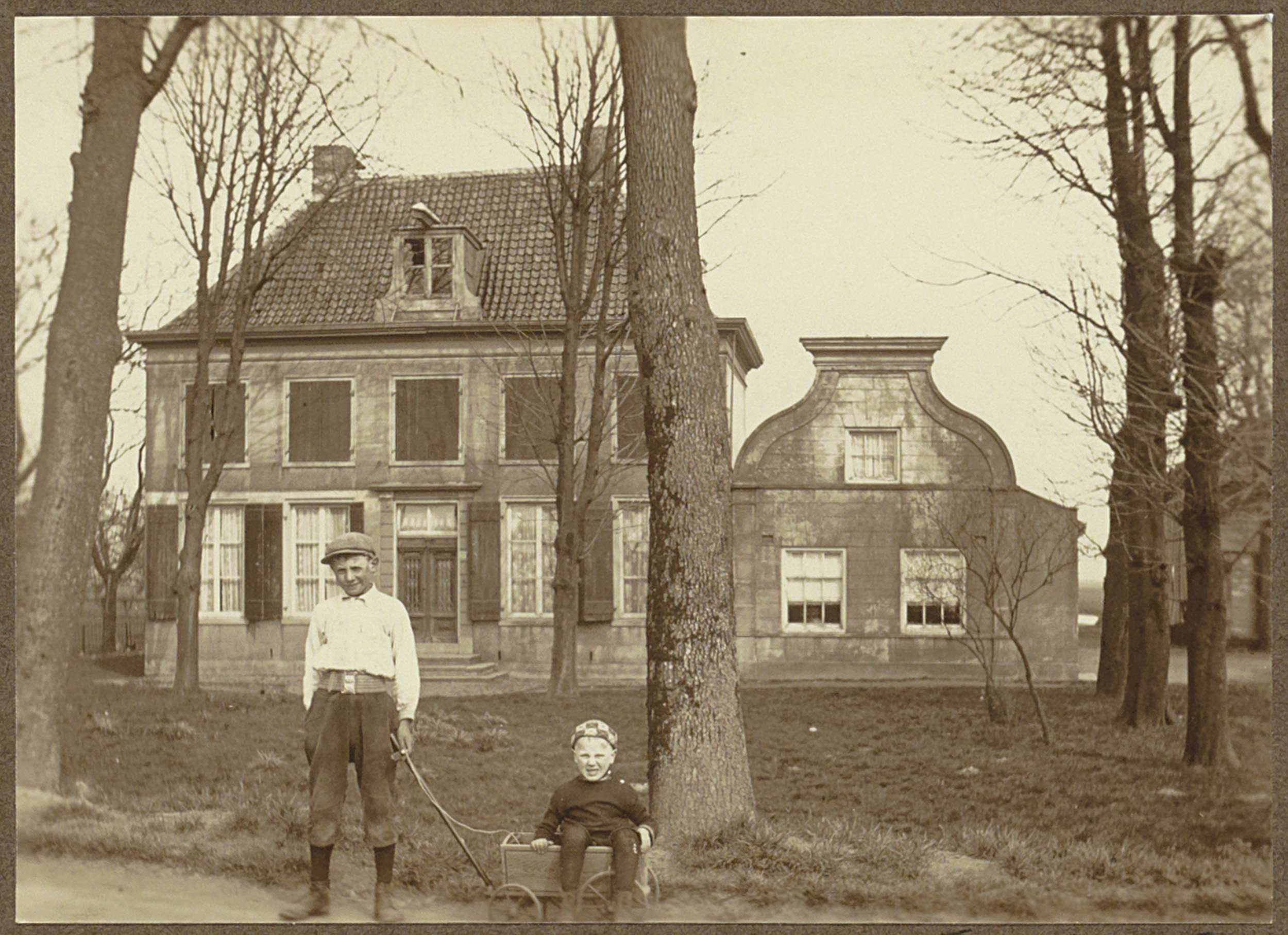 Kinderen met speelgoedkar poserend voor huizen aan d...