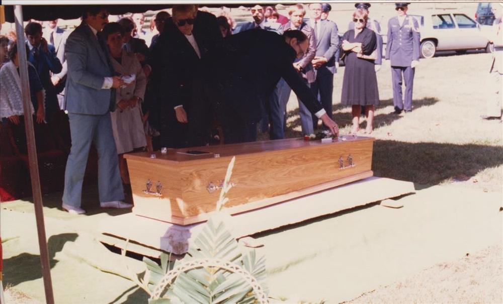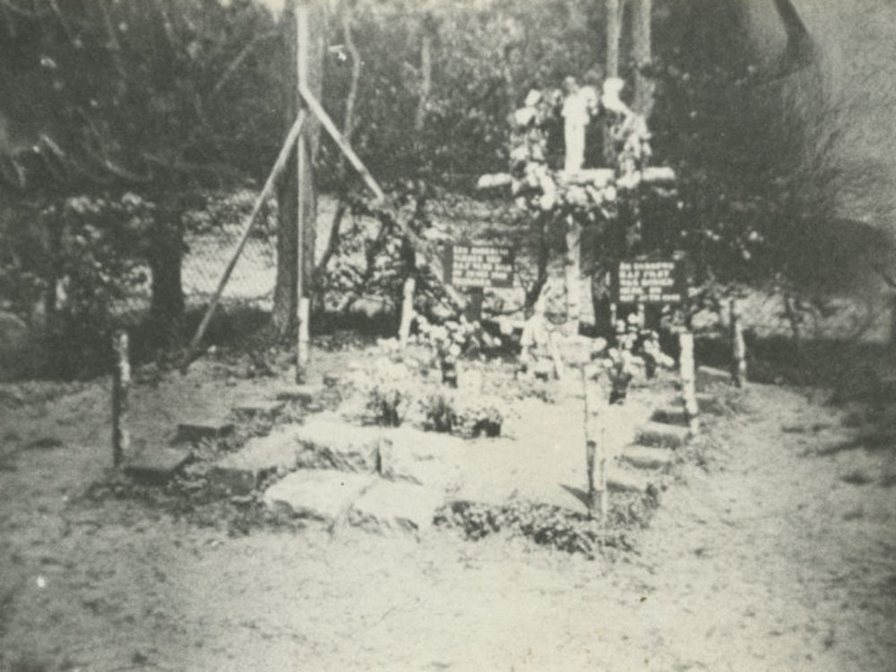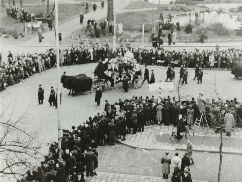 Foto van burgers en militairen op een begraafplaat, ...