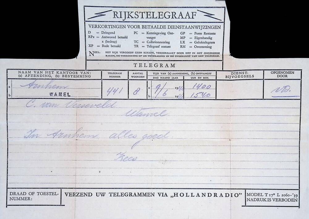 Telegram voor de familie van Verseveld te Wamel