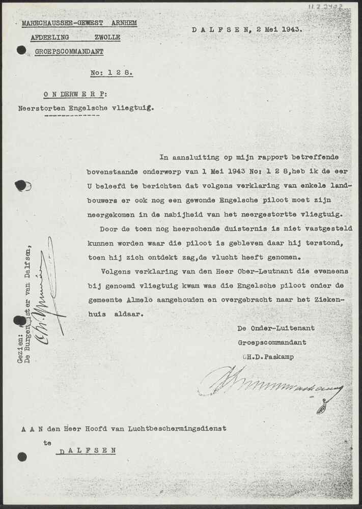 Rapport No. 128 Marechaussee Gewest Arnhem 2 mei 1943.