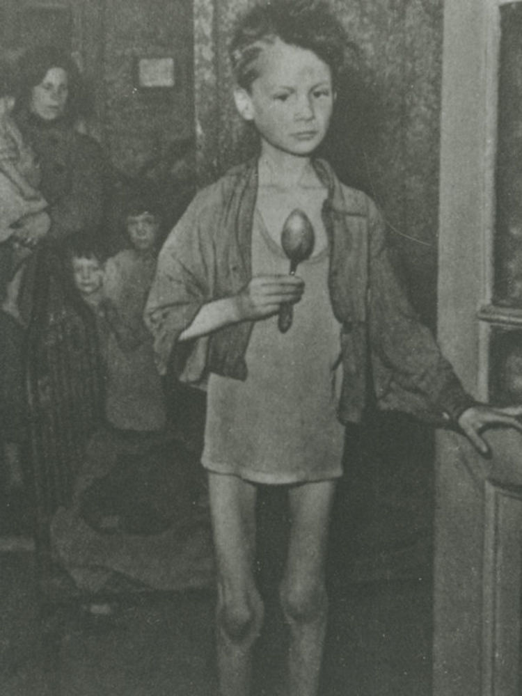 Foto jongen in hemdsmouwen met lepel in de hongerwin...