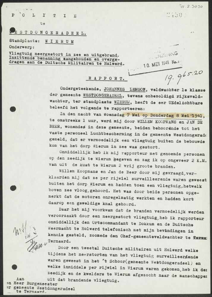 Rapport Politie te Westdonegradeel-Wierum 10-05-1941.