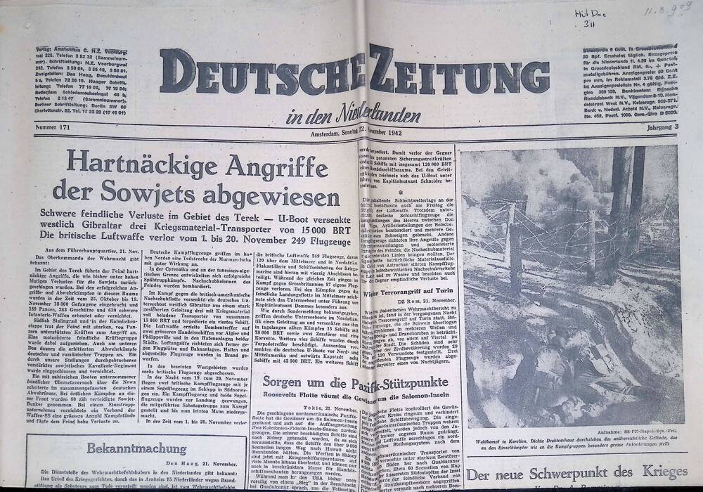 Deutsche Zeitung in den Niederlanden. 22 november 1942.