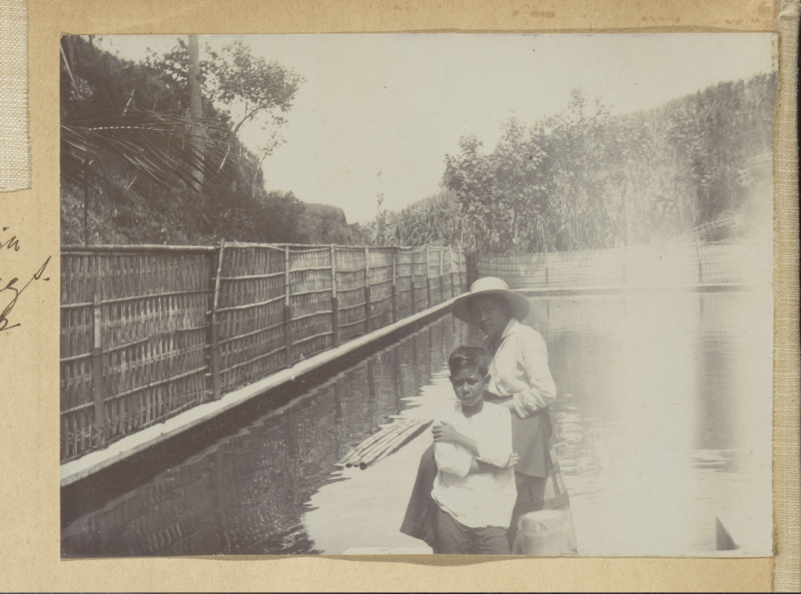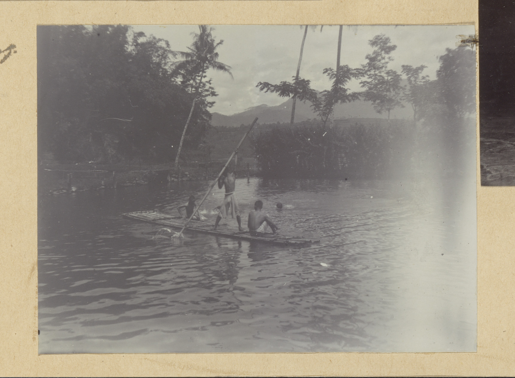 Jongens op een vlot bij Kali Taman in Nederlands-Indië
