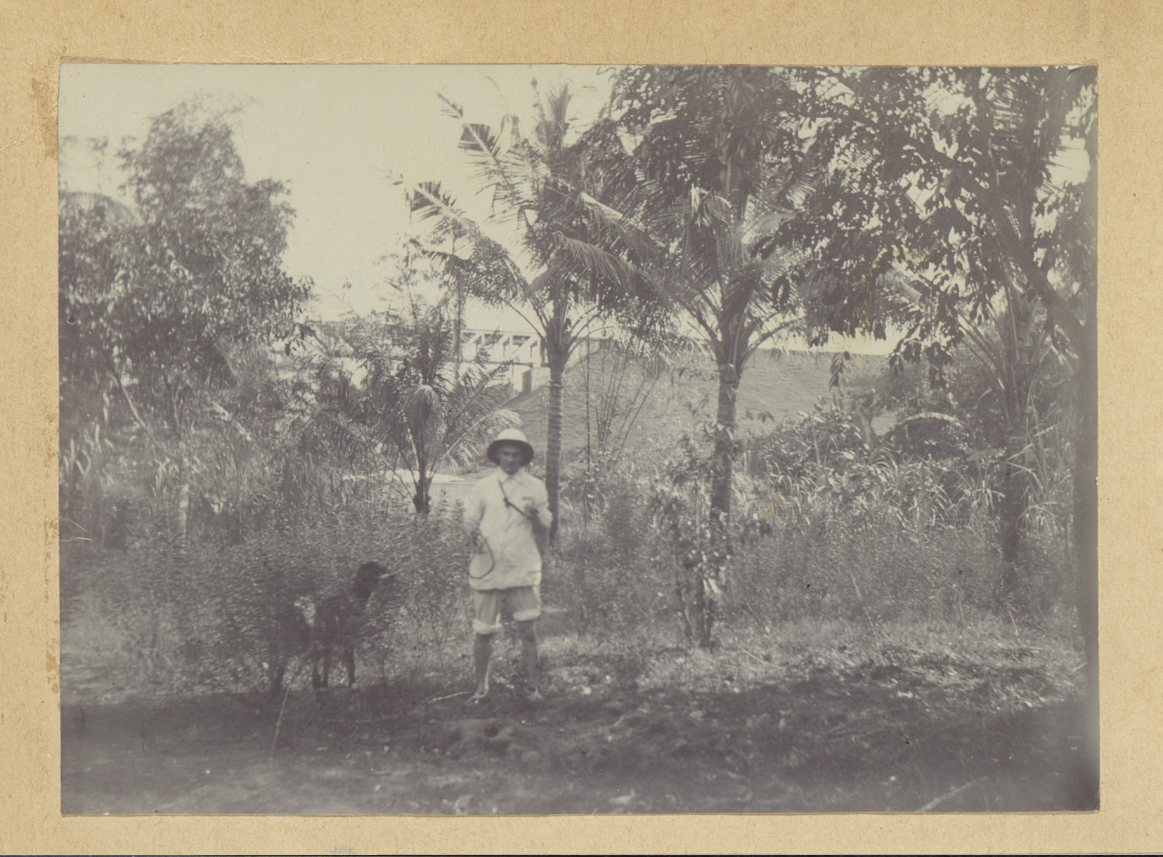Man met geit in een veld in Nederlands-Indië, op de ...