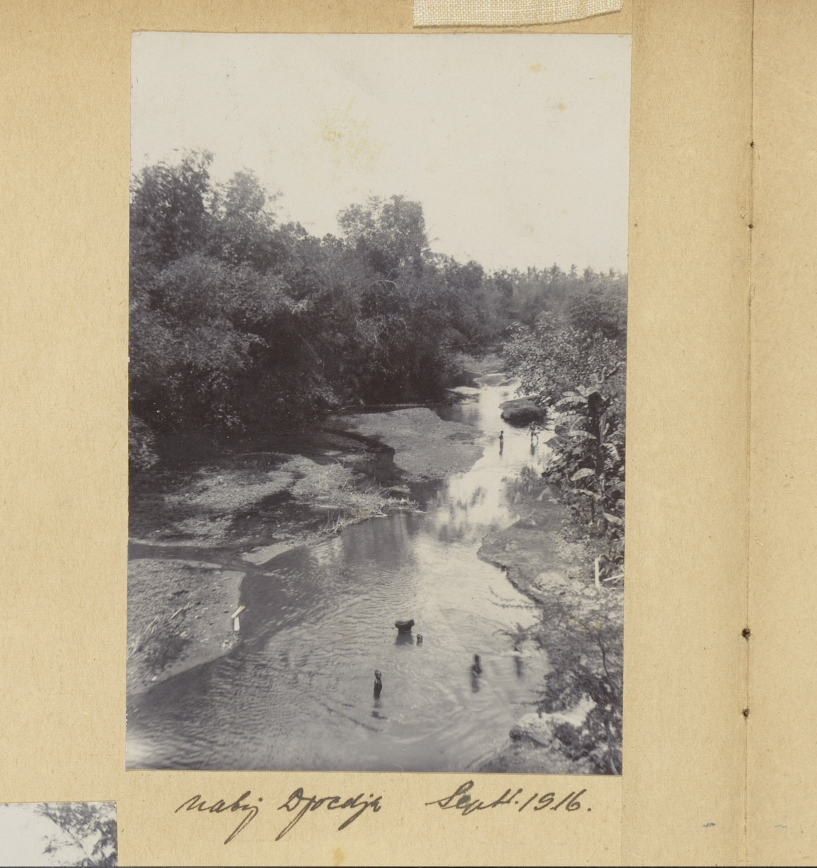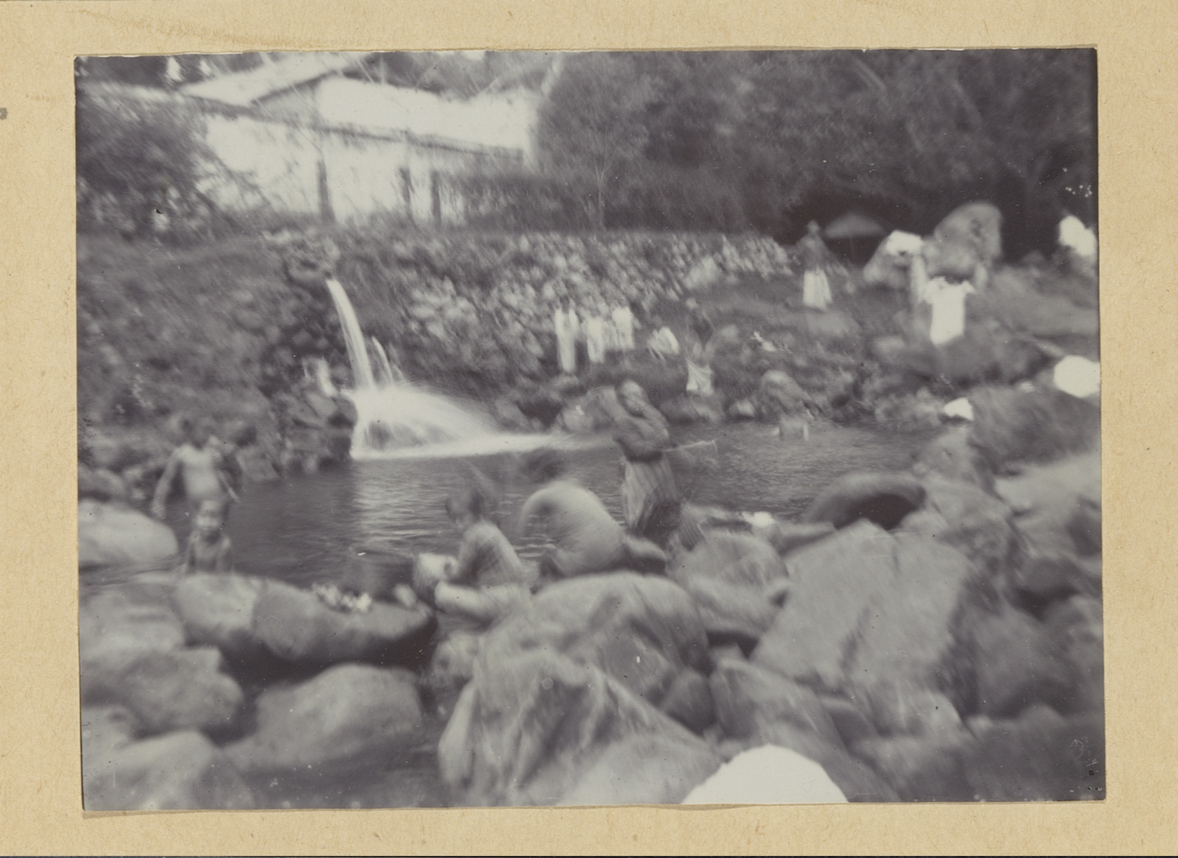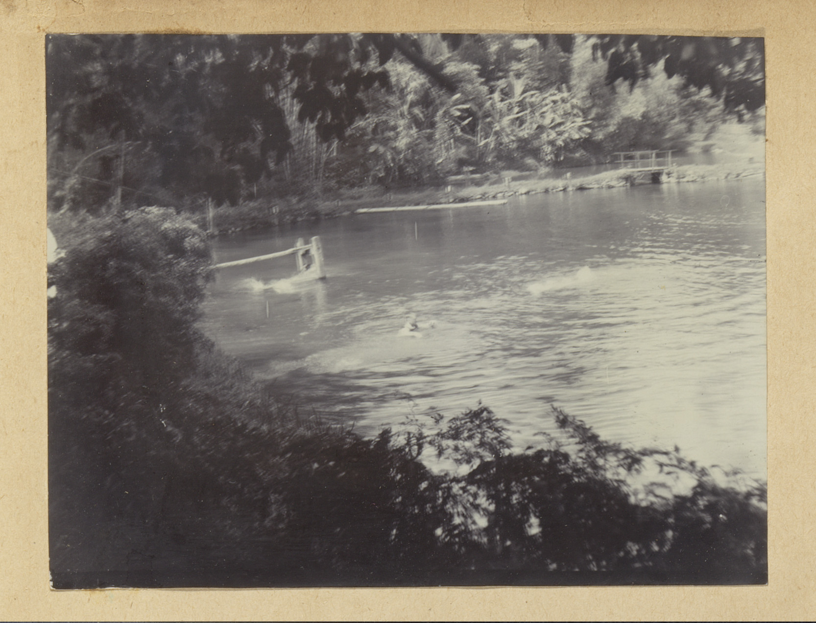Gezicht op een rivier met zwemmers in Nederlands-Indië