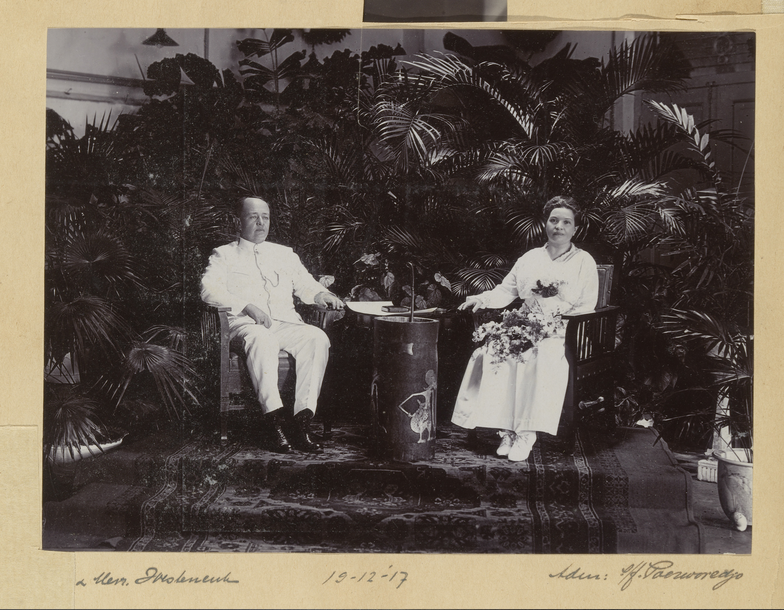 Portret van een echtpaar in Nederlands-Indië, man ve...