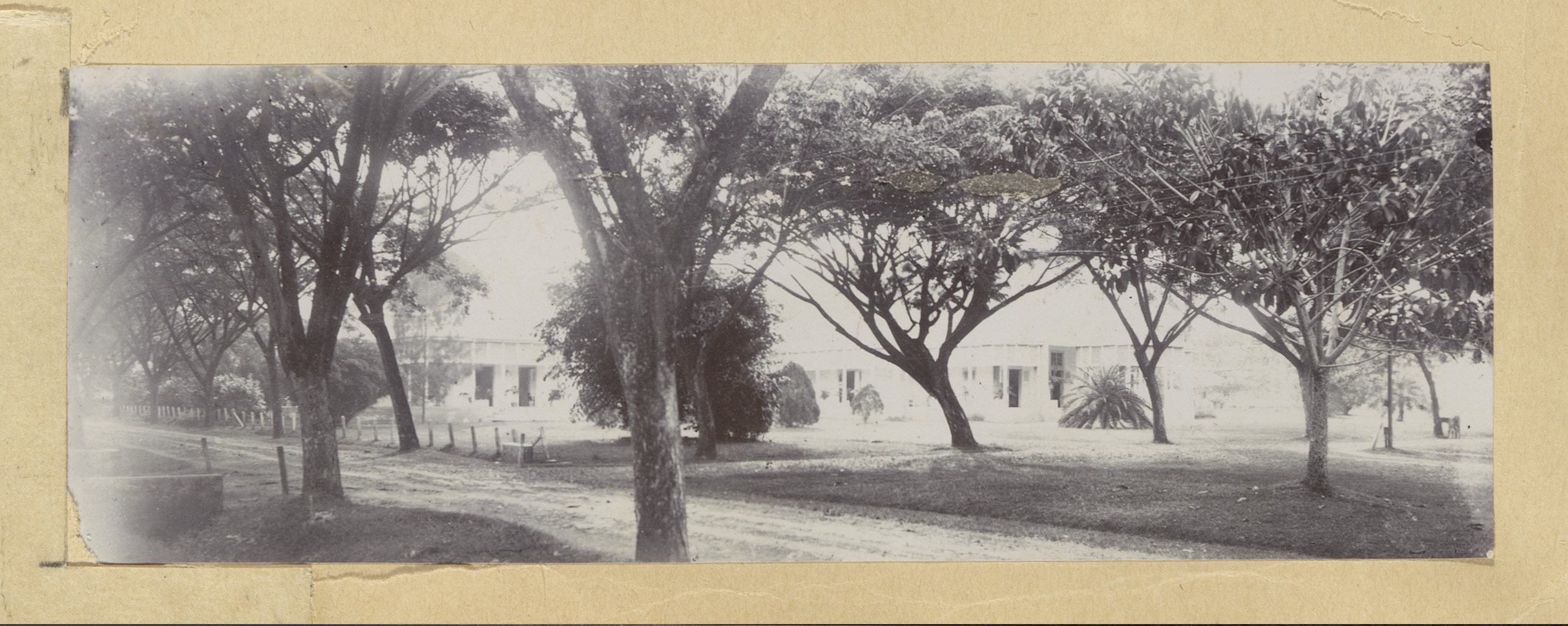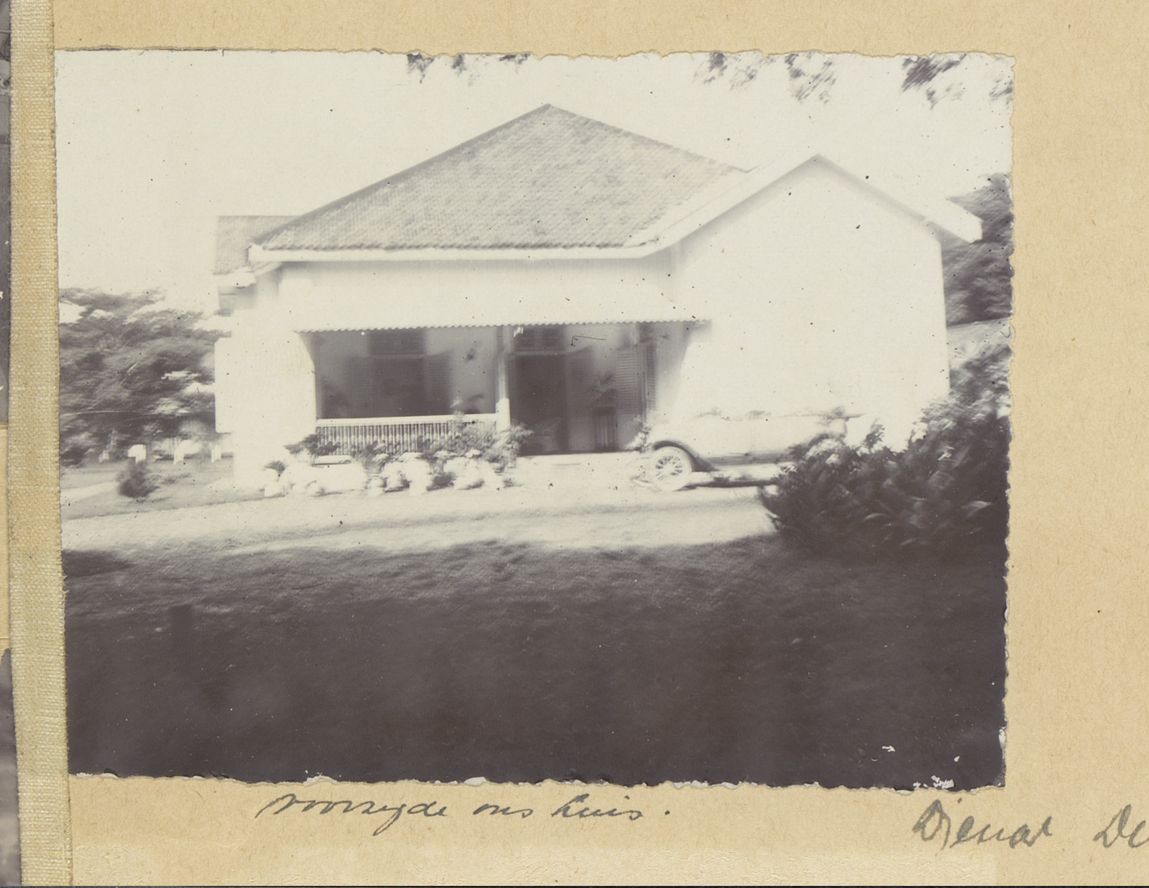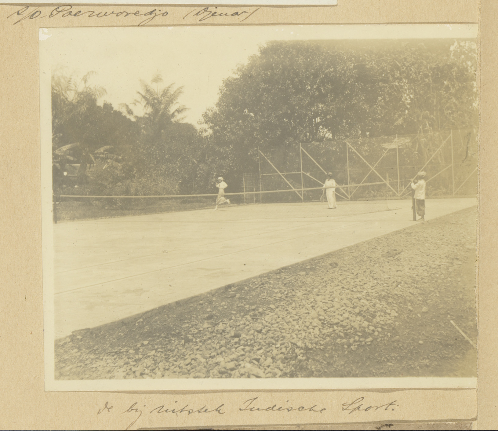 Gezicht op een huis met tennisbaan in Nederlands-Indië