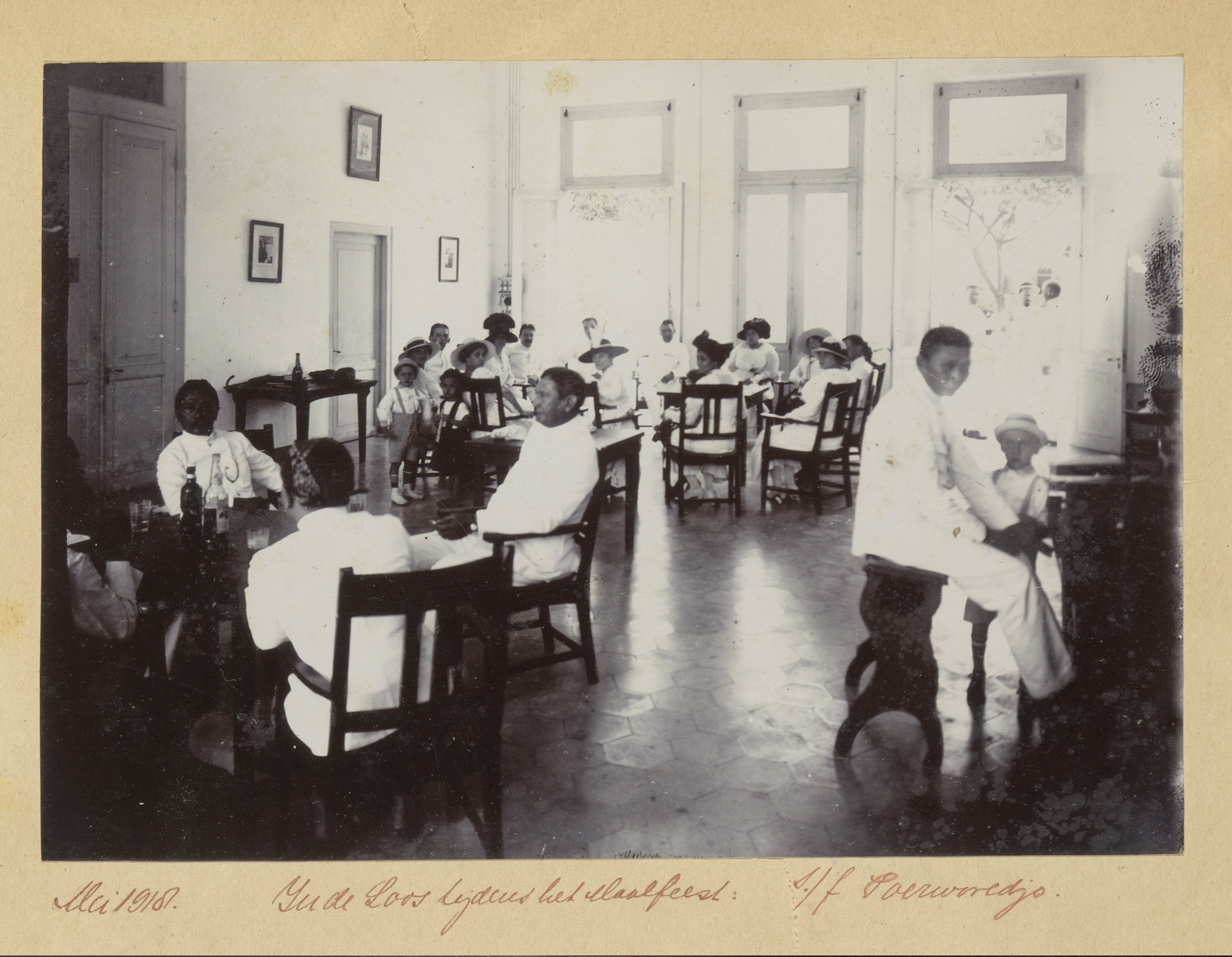 Groepsportret van Indonesiërs en Europeanen in een f...
