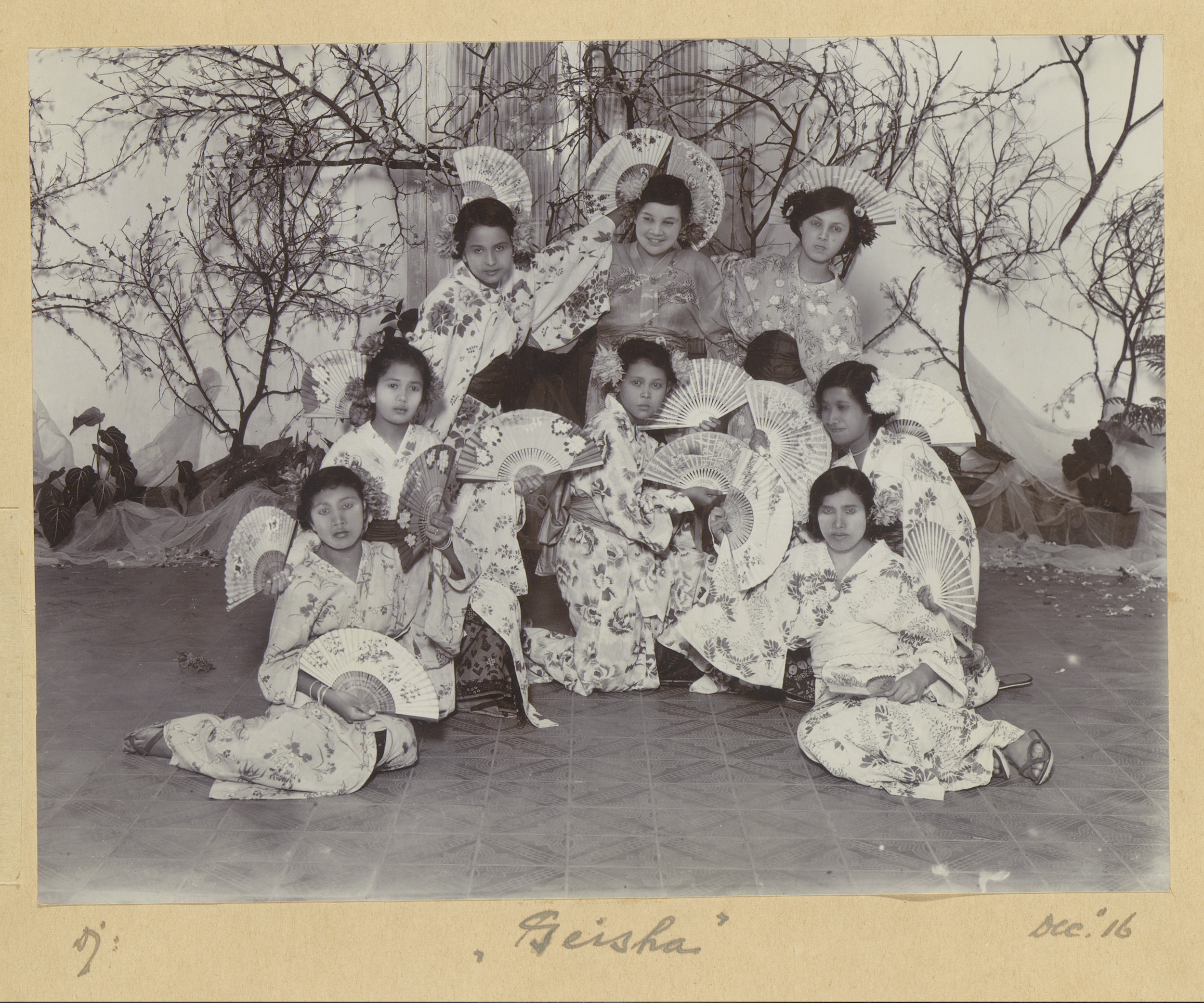 Groepsportret van jonge vrouwen in Japanse gewaden m...
