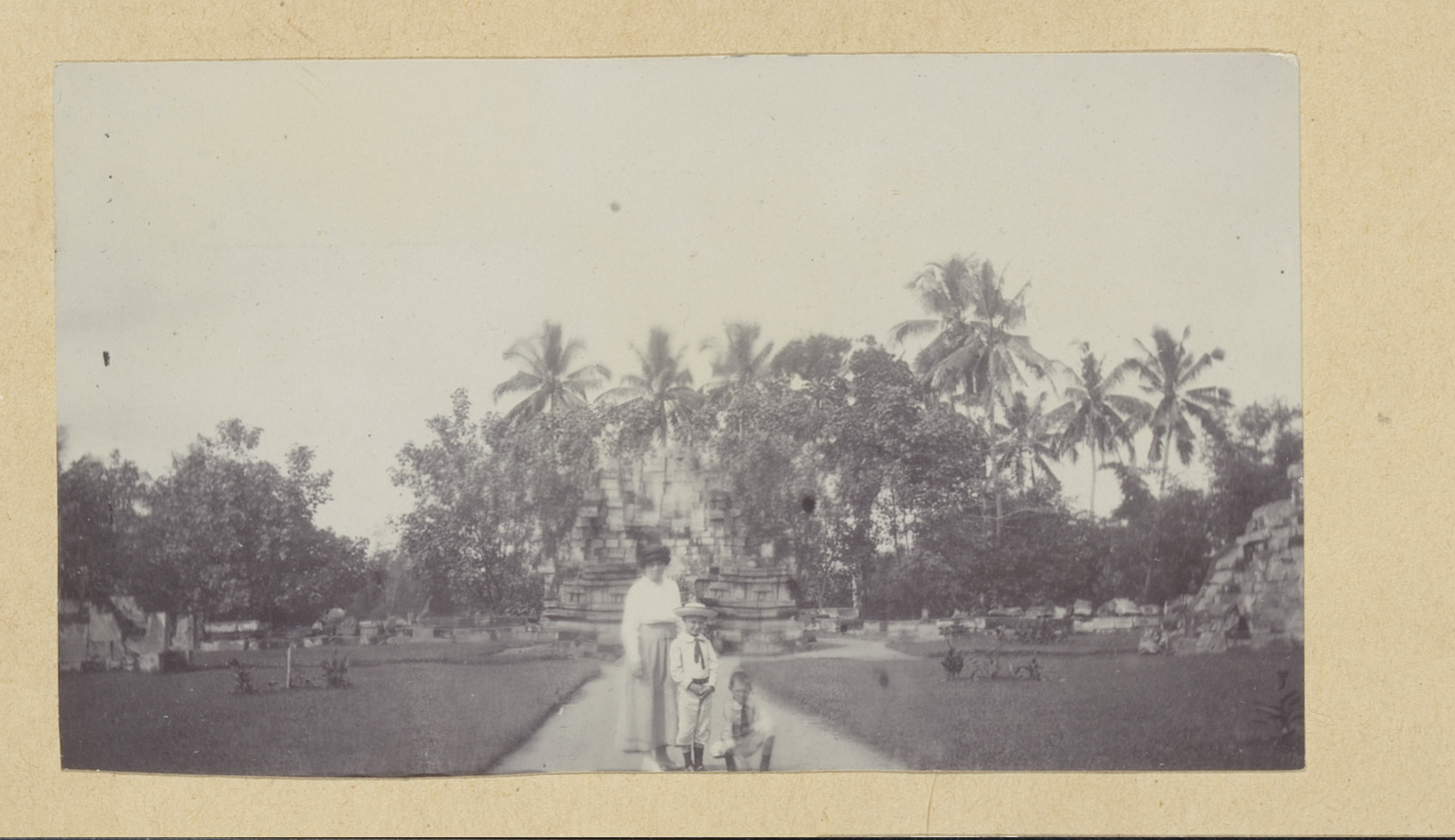 Vrouw met twee kinderen bij een oud bouwwerk, mogeli...