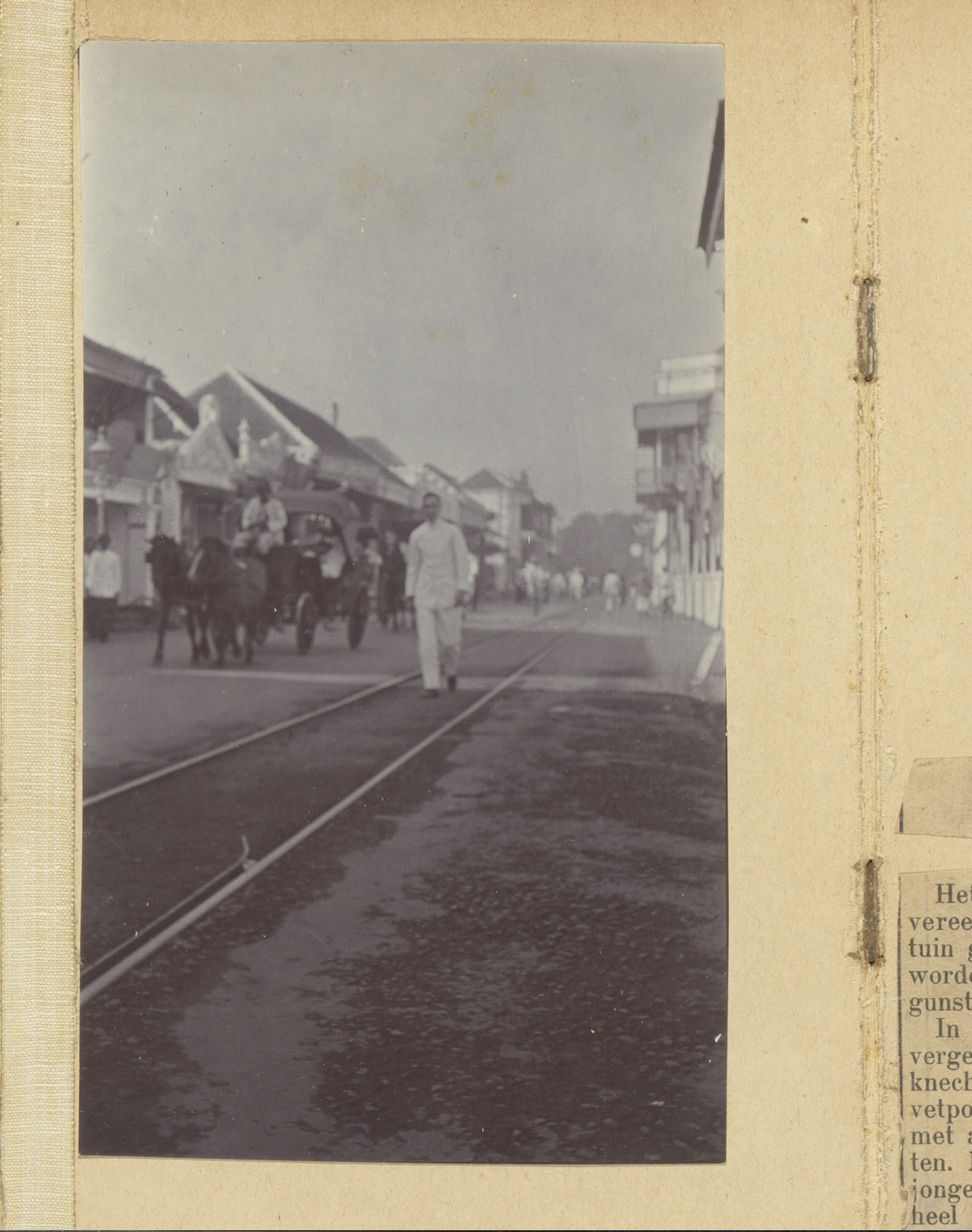 Straat in Nederlands-Indië met man in tropenkleding ...