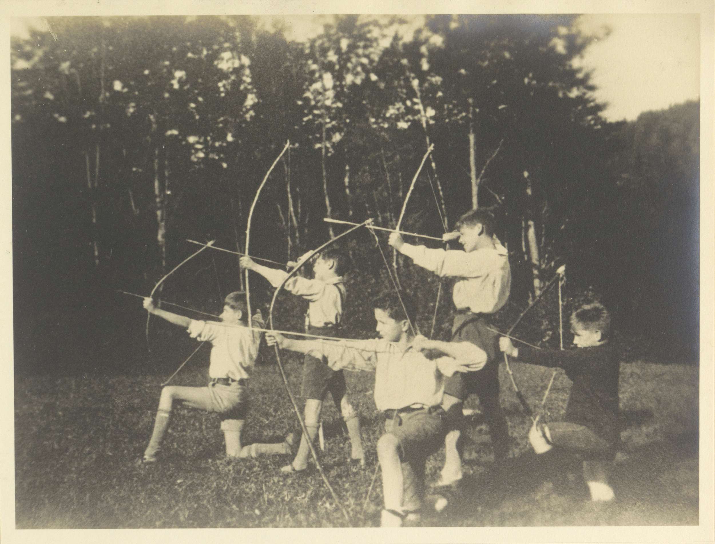 Jonge leerlingen tijdens het boogschieten in Hermann...