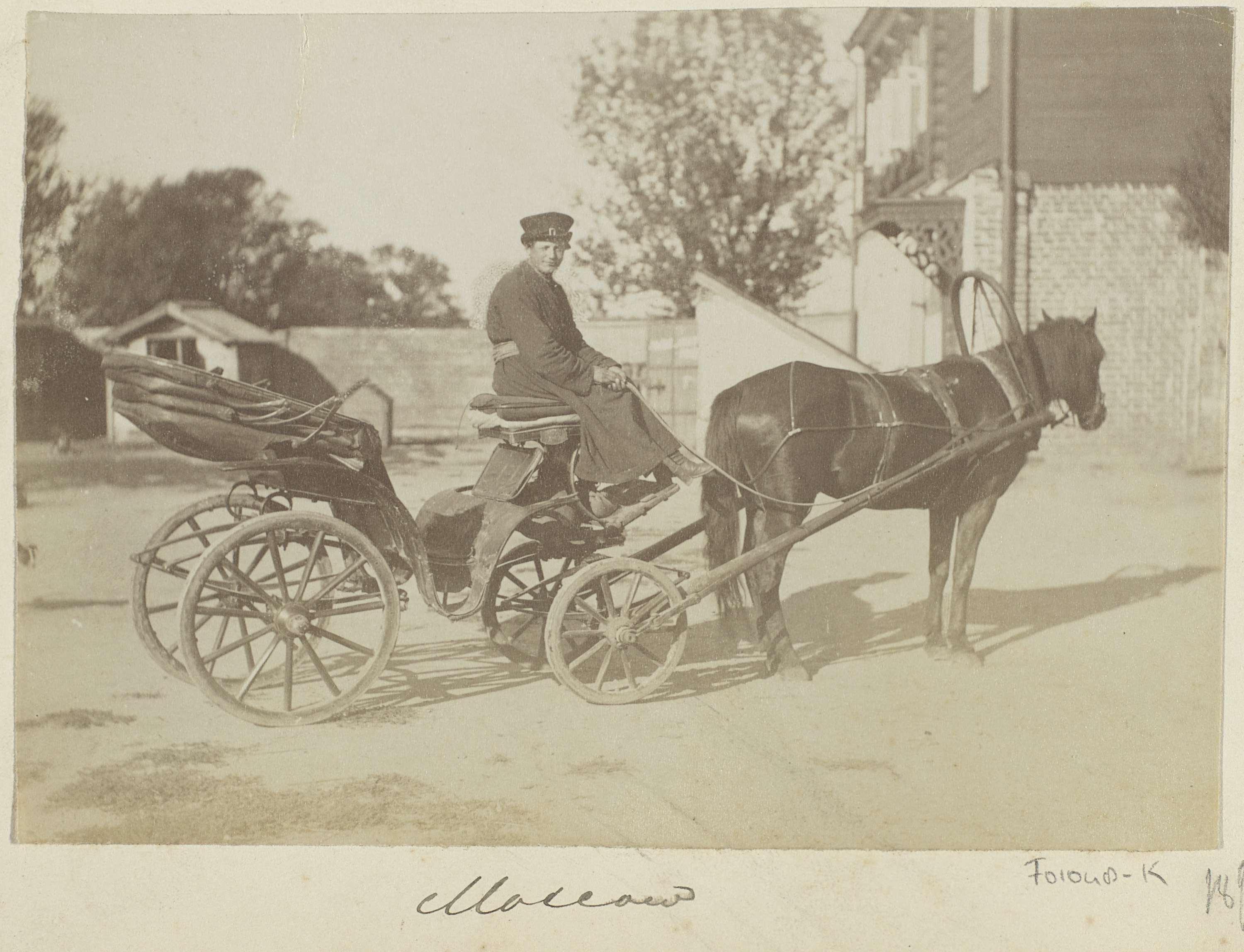 Jonge koetsier met paard en wagen bij een huis in Mo...