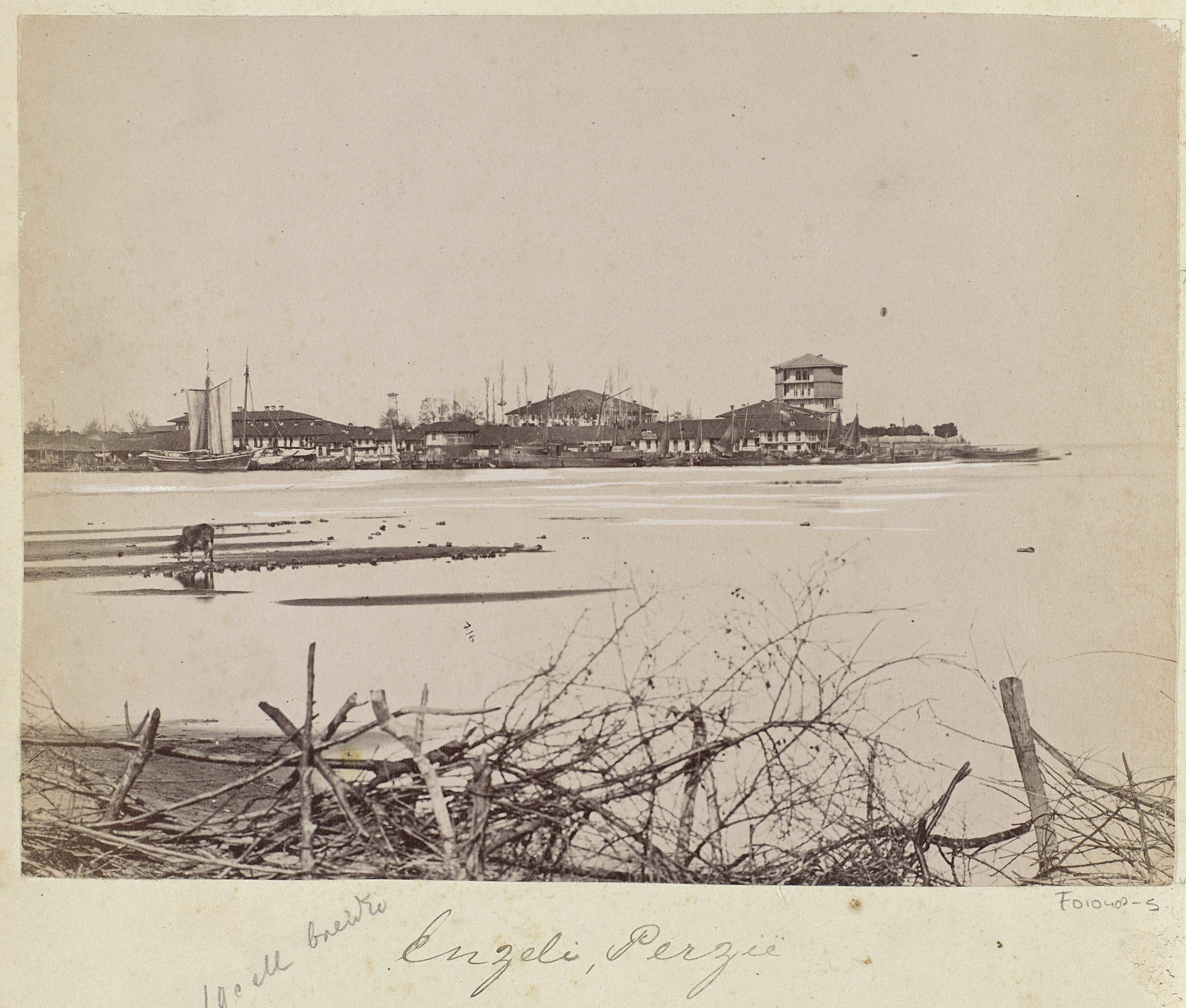 Zeehaven Bandar-e Anzalī in Perzië gezien over het w...