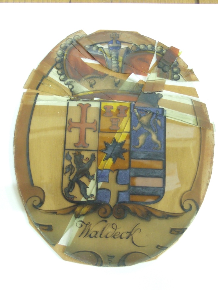 Medaillon van gebrandschilderd glas voorstellende he...